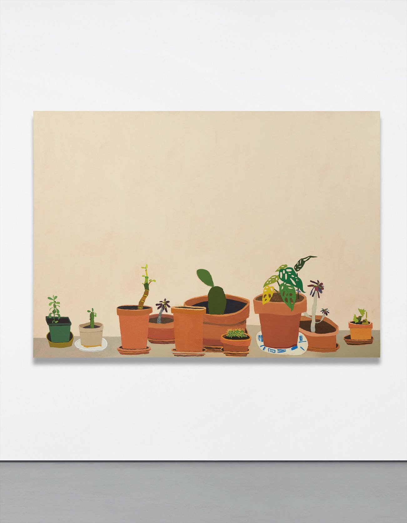 The present work may also serve as a glimpse into the artist’s private life — with its intimate title and telling terracotta pots, the piece may be taken as a reference to Wood’s wife, the ceramicist Shio Kusaka. Considering that the couple was newly married in 2002, it is unsurprising that the artist wanted to look forward to a future life of growth together when painting Group Portrait — a fitting metaphor one may extrapolate from the huge amount of blank wall visible above the young potted plants in the work.