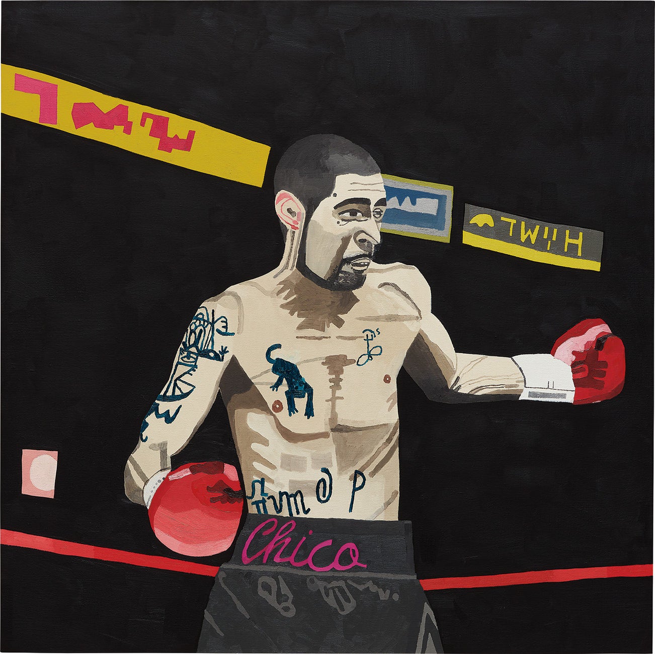 In Chico, Wood imbues the painting with an emotional depth that belies the flatness of the composition. Wood’s reduction of the background to a near-monochromatic black, apart from a few visual cues of the boxing arena, serves to heighten the intensity of the boxer’s physique, which, in contrast, is rendered with dramatic tonal variation. Rather than painting from his imagination, Wood works almost exclusively from photographs and self-made collages, creating paintings that are re-organizations of pre-existing images. As such, his paintings are twice, or sometimes three-times removed from the real-life figures they depict, resulting in an idiosyncratic blend of realism and abstraction that distorts the subject and adds new layers of meaning.
