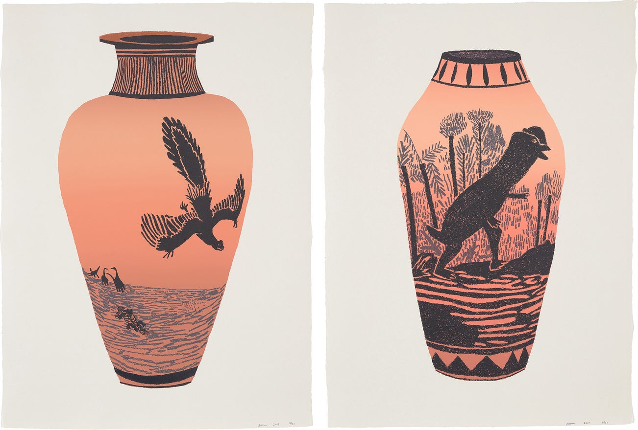 Two lithographs in colours, on Barcham Green Boxley De Wint Eggshell paper, with full margins.