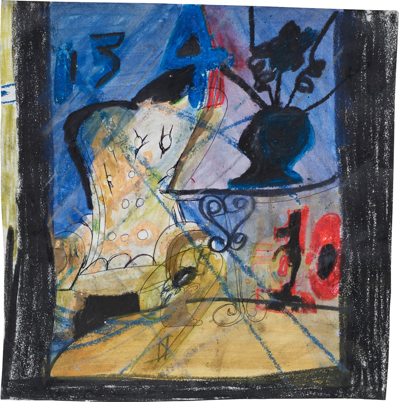 glitter, oil pastel, marker and graphite on paper