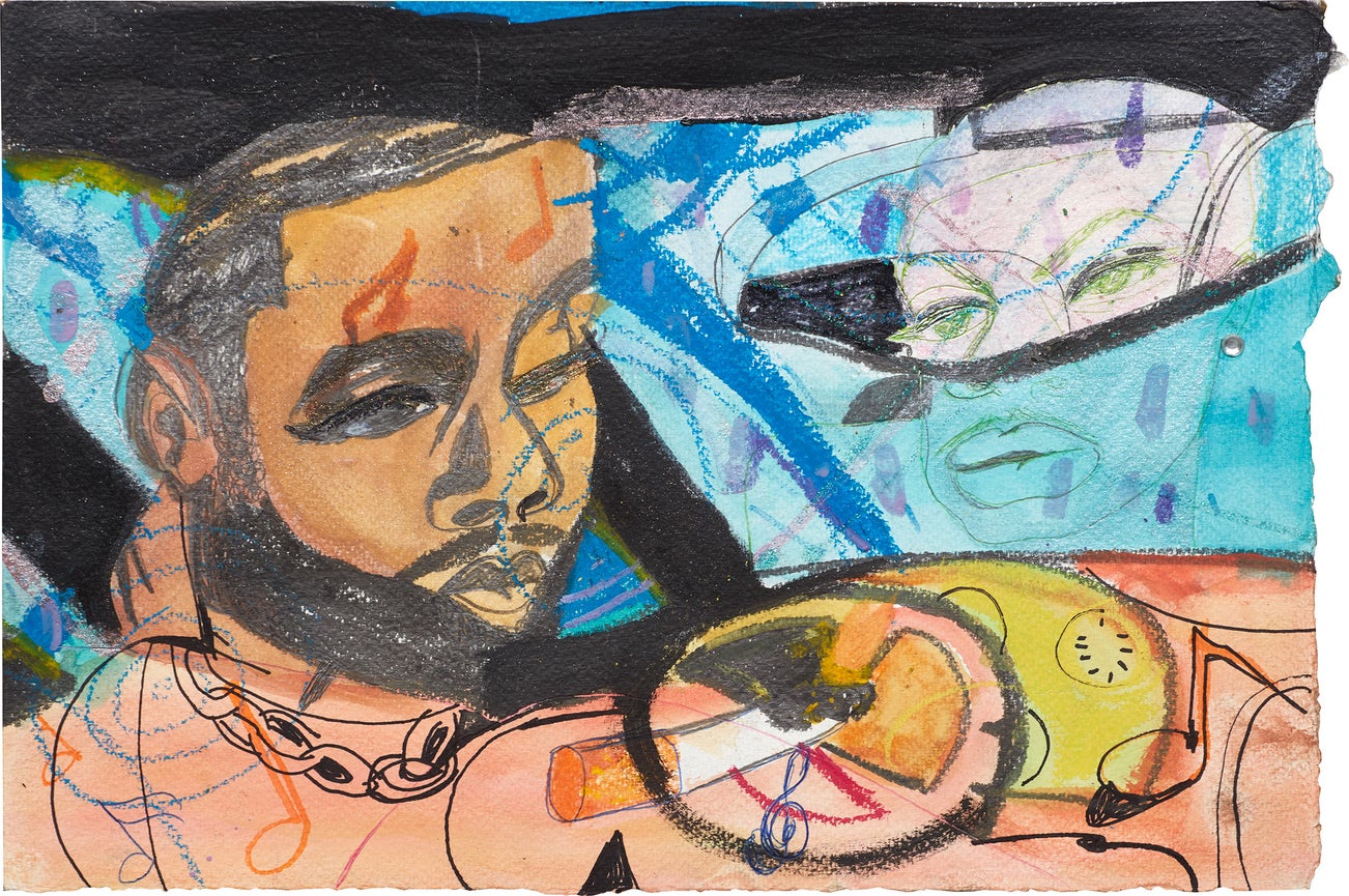 watercolor, pen, graphite, marker, glitter and plastic stone on paper