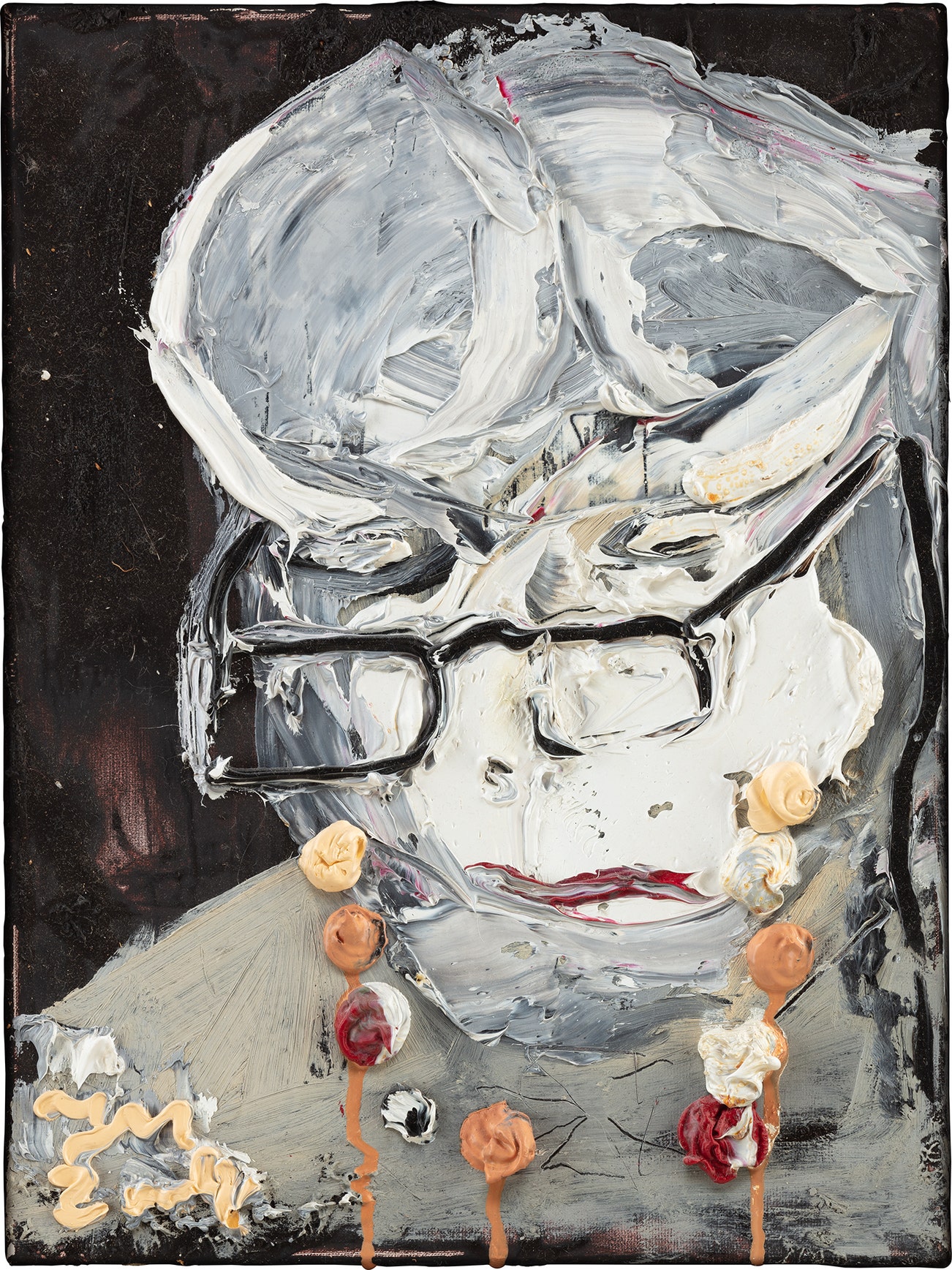 signed with the artist's initials and dated "JM 2004" lower left; signed, titled and dated "JMeese 2004 Diamantenmutter mit schwarzer Brille, bunter Perlenkette und rötlichem Schlangemund JMeese 2004" on the reverse
