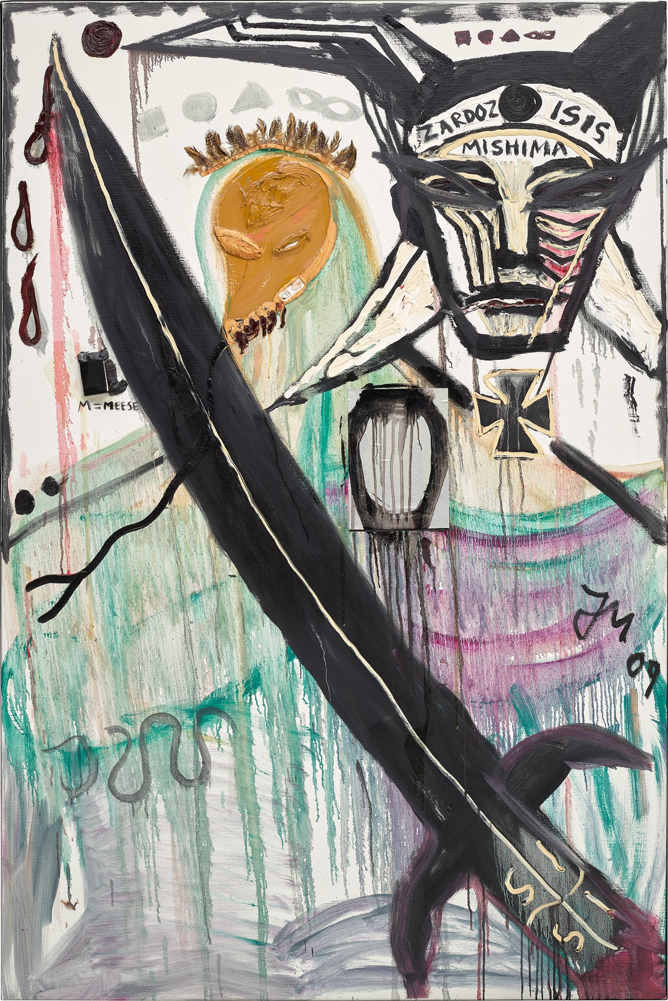 signed with the artist's initials and dated 'JM 09' centre right; signed, titled and dated 'IST DIE WELT LiEB ? Jonathan Meese 09 Jonathan Meese 09' on the reverse