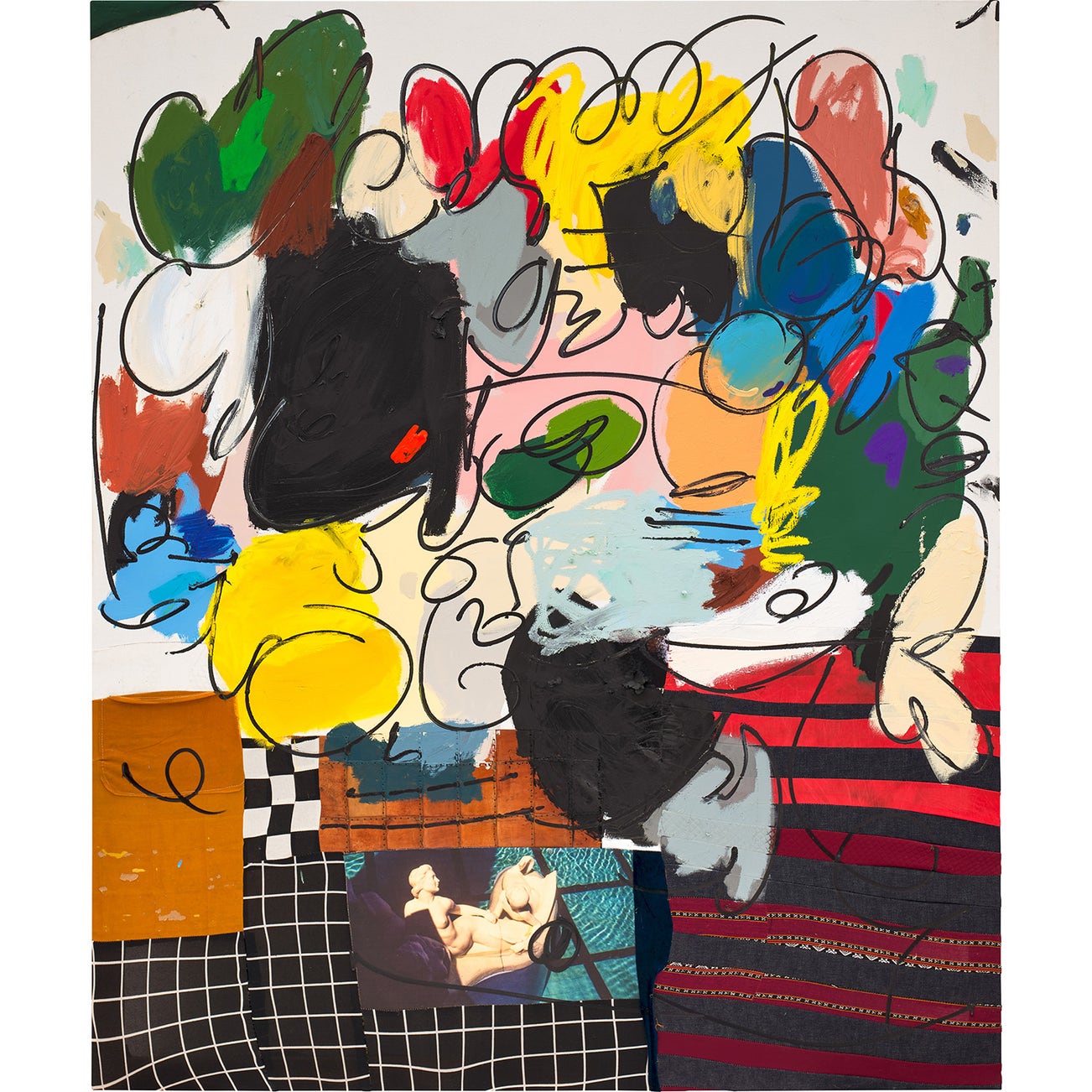 oil, oilstick, acrylic, enamel, printed canvas, string and fabric collage on canvas