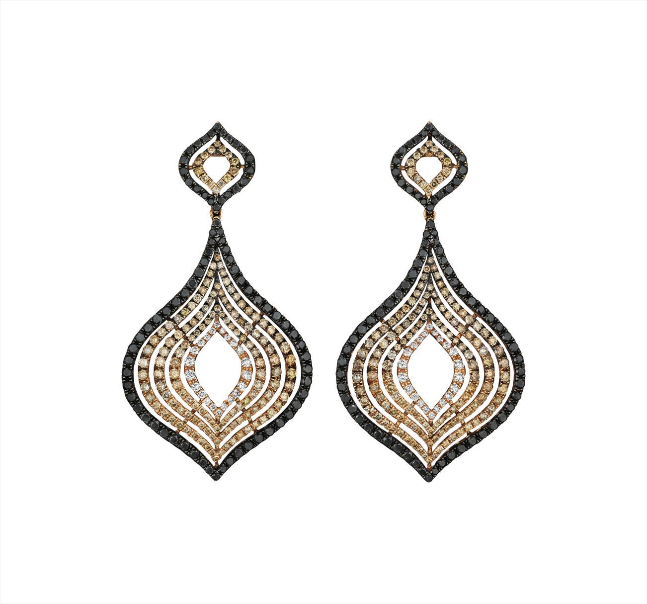 Each designed as an open-work navette-shaped plaque entirely set with circular-cut diamonds and colored diamonds, to the similarly designed surmount, mounted in 18K rose gold, length 2 1/2 inches.