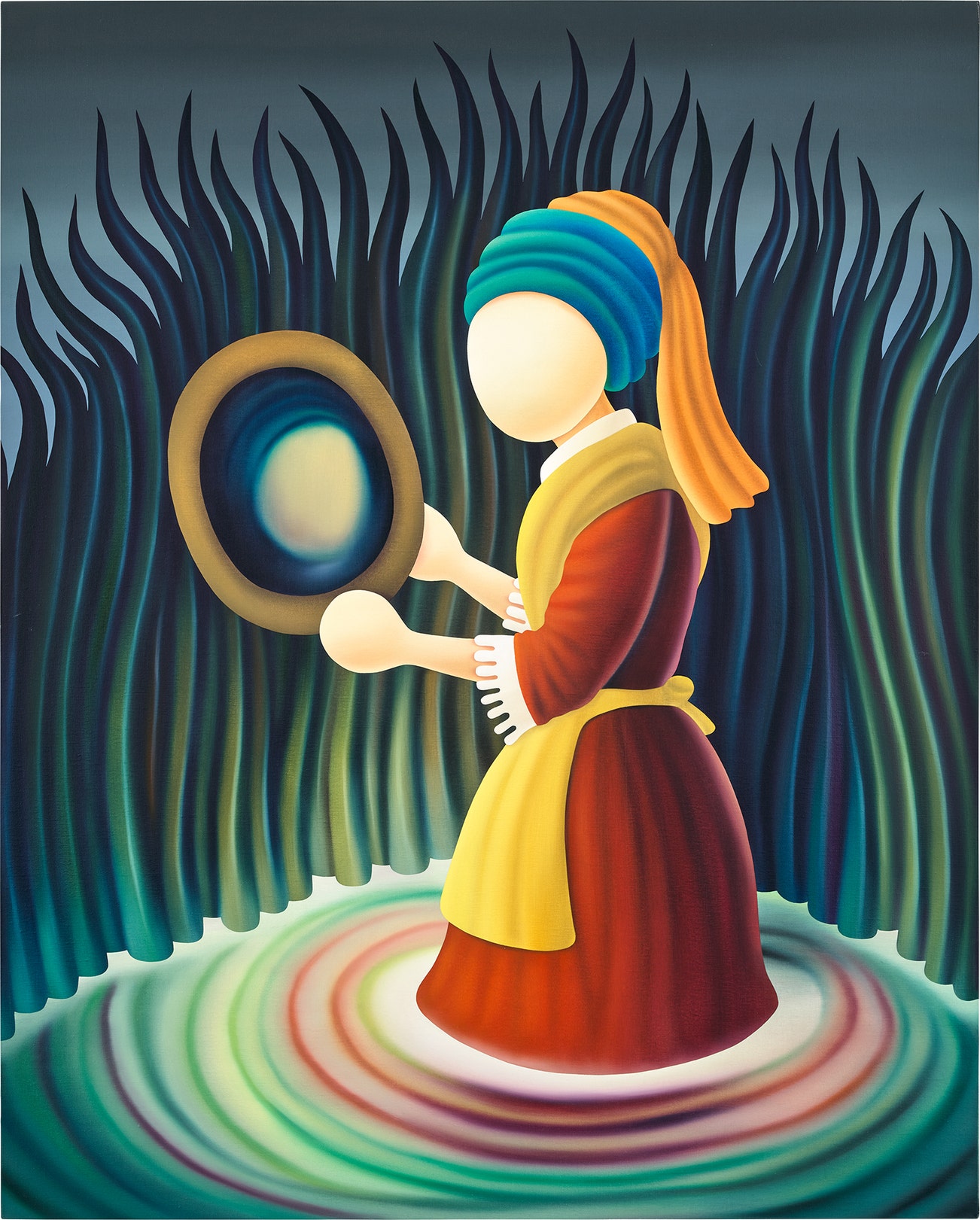 SpanishJordi Ribes (b.1972) is a contemporary painter based in Barcelona, Spain. The artist originally studied graphic design before studying painting at the University of Barcelona. He is known for his faceless figures found in lush settings. He uses rich jewel-toned paint colors to depict scenes detached from the real world.