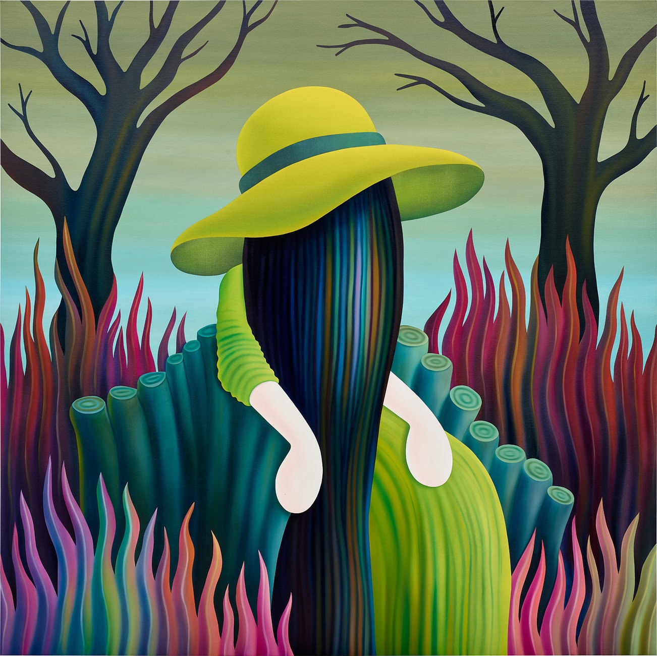 SpanishJordi Ribes (b.1972) is a contemporary painter based in Barcelona, Spain. The artist originally studied graphic design before studying painting at the University of Barcelona. He is known for his faceless figures found in lush settings. He uses rich jewel-toned paint colors to depict scenes detached from the real world.