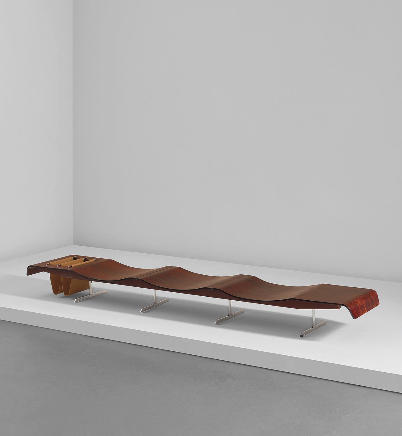 Stained wood-veneered plywood, chromium-plated metal, leather.