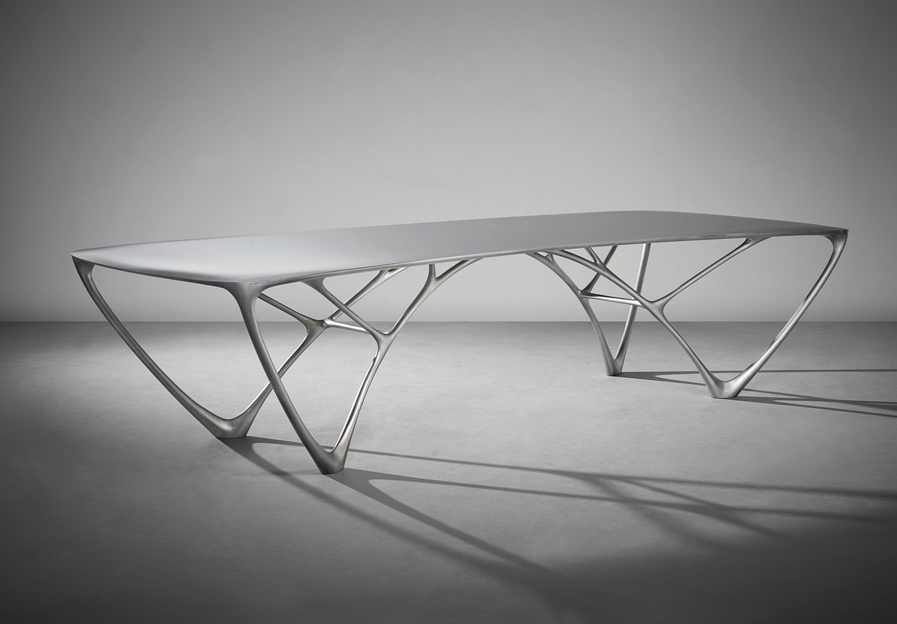 Bridge table is an excellent example of this fusion. It is a monocoque object made in aluminium and tungsten carbide created by algorithms, robots and craftsmen. Its shiny table top continues fluently into an organic structure that supports the table from four points on the ground forming an arch in the middle. The organic appearance is increased through bracing rods that stabilise the arch. The reference is unmistakably bone structures which were Laarman’s inspiration for a whole collection of furniture.