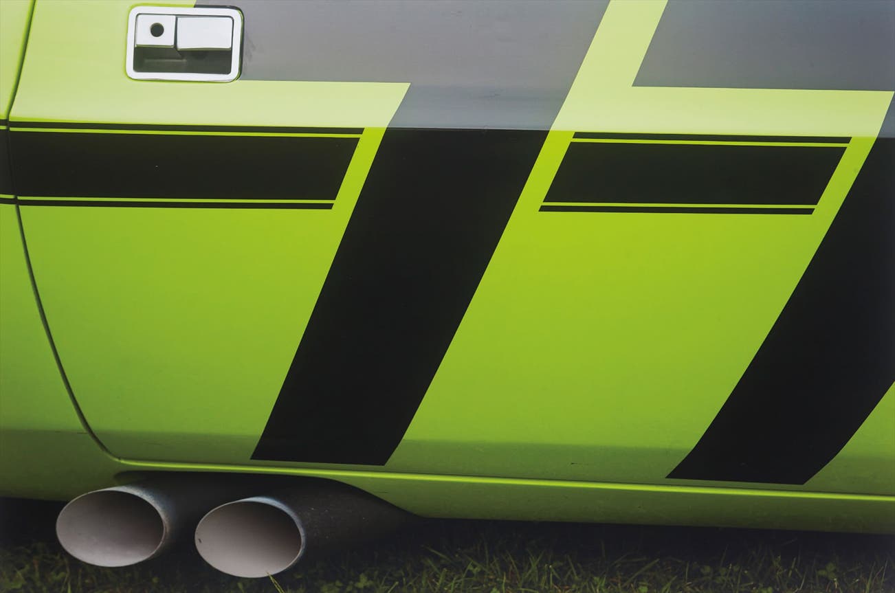 Hull’s series My Mind is Racing depicts racing cars from the 1950s and 70s, a largely handmade era of design and fabrication. Hull transforms these machines into graphic compositions of surfaces and details. In Challenger (#77), Hull captures the essence of the sublime green and the graphic “77” of this iconic Trans Am car.