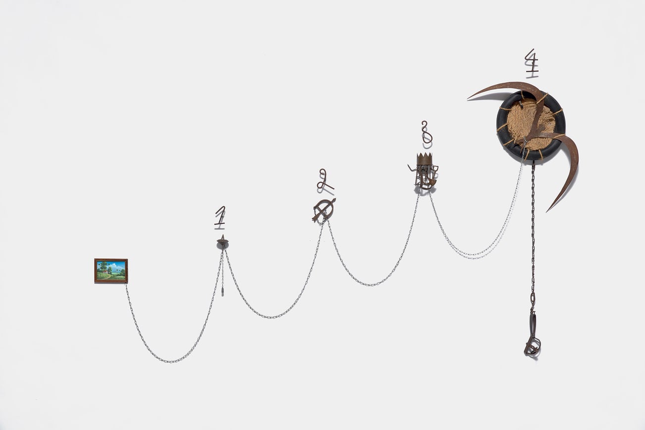 aluminum, copper, rubber, rope, steel, chalk and found objects