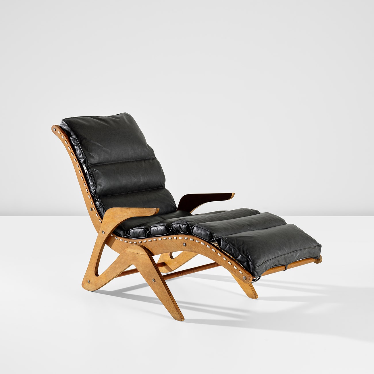 Veneered plywood, cedar, leather, rope, nickel-plated steel.
