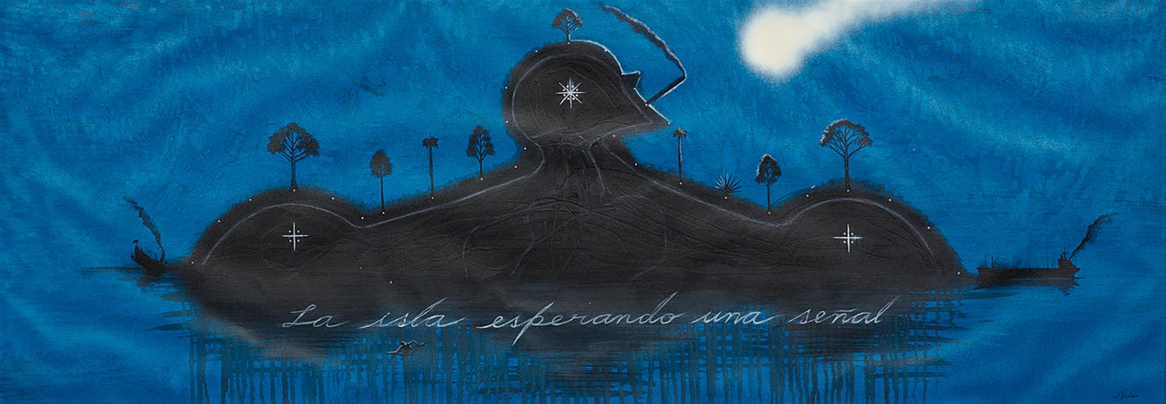 signed, titled and dated "La isla esperando una señal J Bedia 02" lower edge