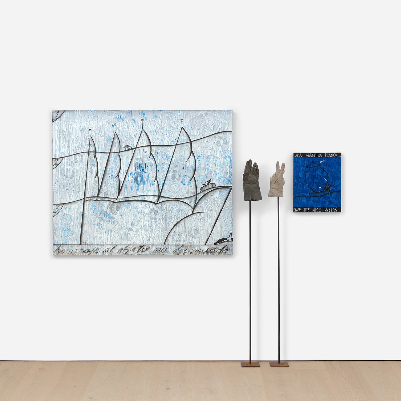 used workman's gloves, suede and cotton on rebar poles and acrylic on canvas, in 4 parts