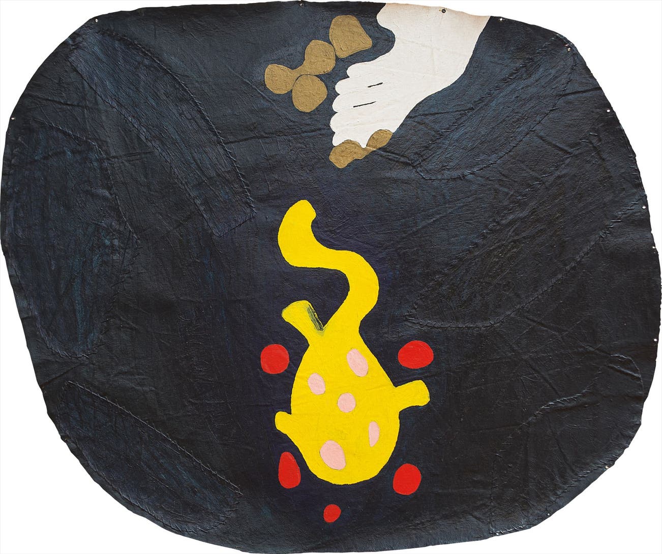 While many of Leonilson’s early works are comprised of drawings and paintings influenced by the Transavantgarde movement, the present lot marks an important turning point in the artist’s oeuvre, as it was one of his last in the traditional medium of painting. In 1989, Leonilson began to experiment with embroidery, influenced by untrained Brazilian artist Artur Bispo do Rosario and Shaker crafts he had seen on a trip to the United States. After Leonilson’s diagnosis with HIV in 1991, and his progressive deterioration, the artist completely abandoned painting and drawing and solely created sewn works. In Rios do Mundo (1990), Leonilson has created a dynamic composition through the use of color contrast. The central yellow river pops against the black background, complimented by the artist’s use of red, pink and white. The organic forms and loose brushstrokes indicate the artist’s interest in developing a personal, subjective expression. The use of cowhide, instead of traditional canvas not only creates an intentionally round composition but also adds a unique material texture to the work. Like much of Leonilson’s work, Rios do Mundo (1990), is an intimate piece that reveals the artist’s struggle to continue to develop a unique means of personal expression despite his worsening condition that limited his ability to do so.