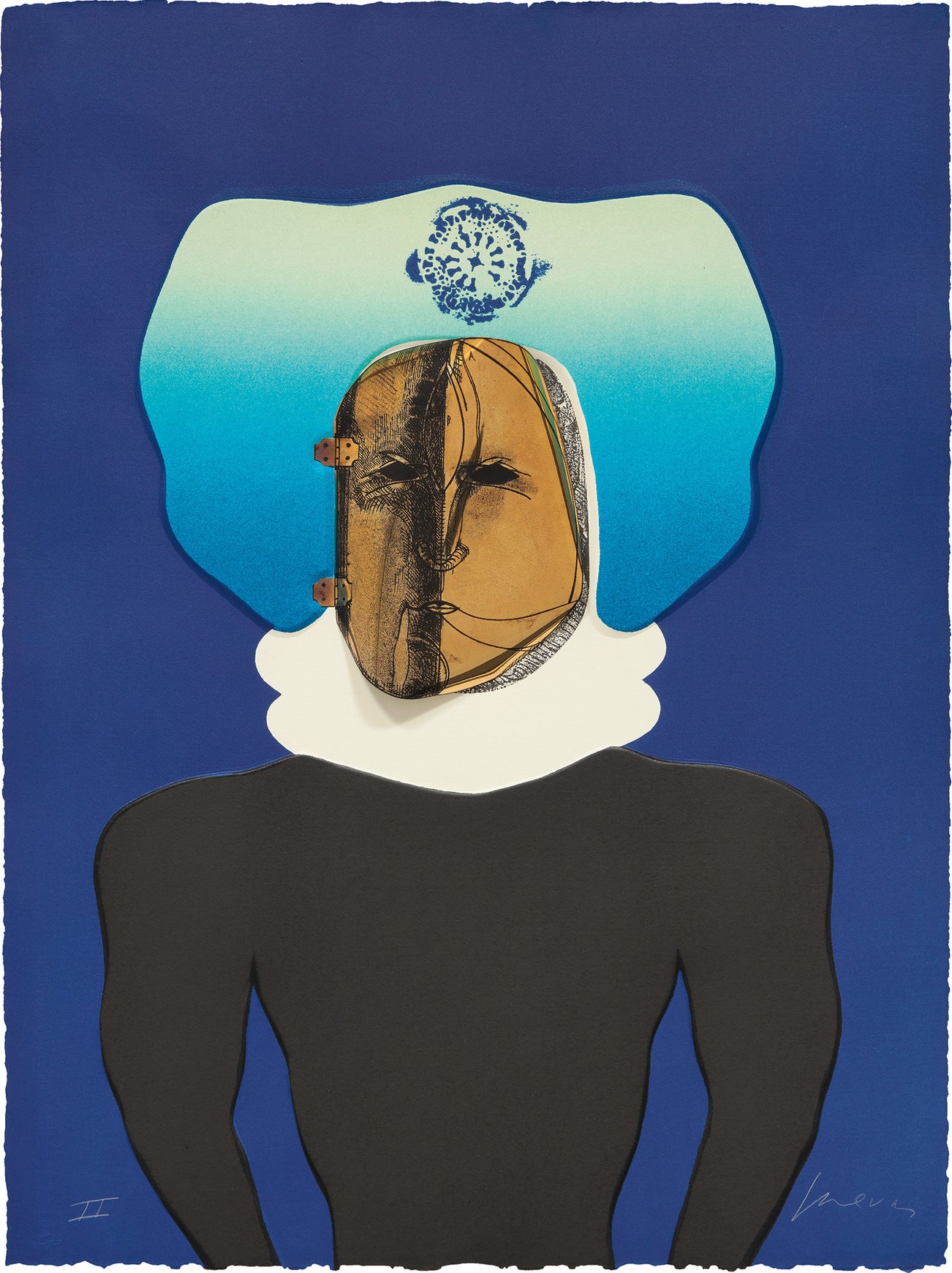 Etching with lithographed mylar collage in colors, on Fabriano paper, the full sheet.