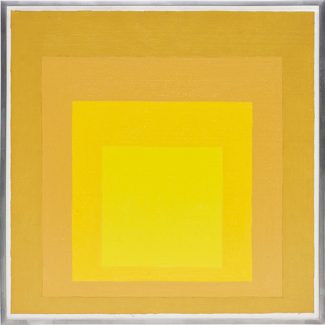 There is a personal association one has to each of Josef Albers’ Homage to the Square paintings, making them visually poignant, as is demonstrated in the present lot from 1962. The Homage to the Square format took root in 1950 while Albers was teaching at the famous Black Mountain College; his artistic practice was informed by his previous Bauhaus teaching and his own European design values which were preferential to minimal, formal and rigid artistic forms. Rendered in shades from sunflower to mustard yellow, each colour in the present work harps on a personal experience, tapping into the emotional complexities of how one perceives and interprets colour. Albers heightens this perception by allowing the physical meeting of different hues, creating a subtle visual tension where one colour starts and another colour ends.