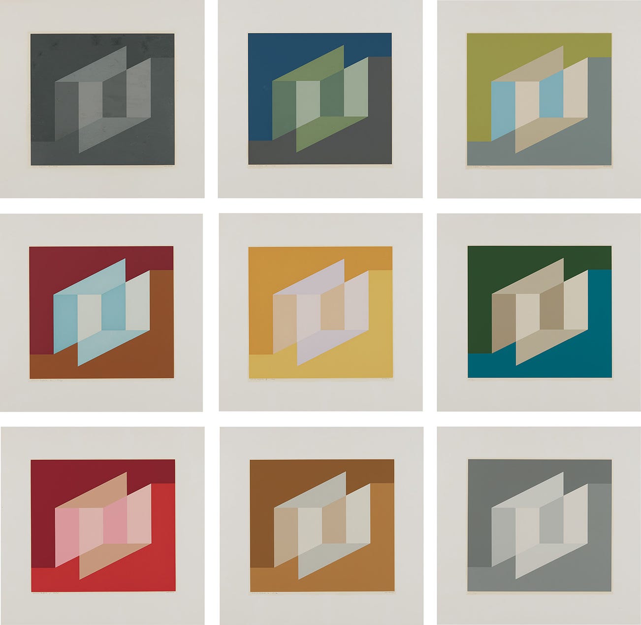 This was Albers' final print portfolio. At the time of his death, he had signed only eight of the 12 prints (d, h, i and l were unsigned) and those have no blindstamps.