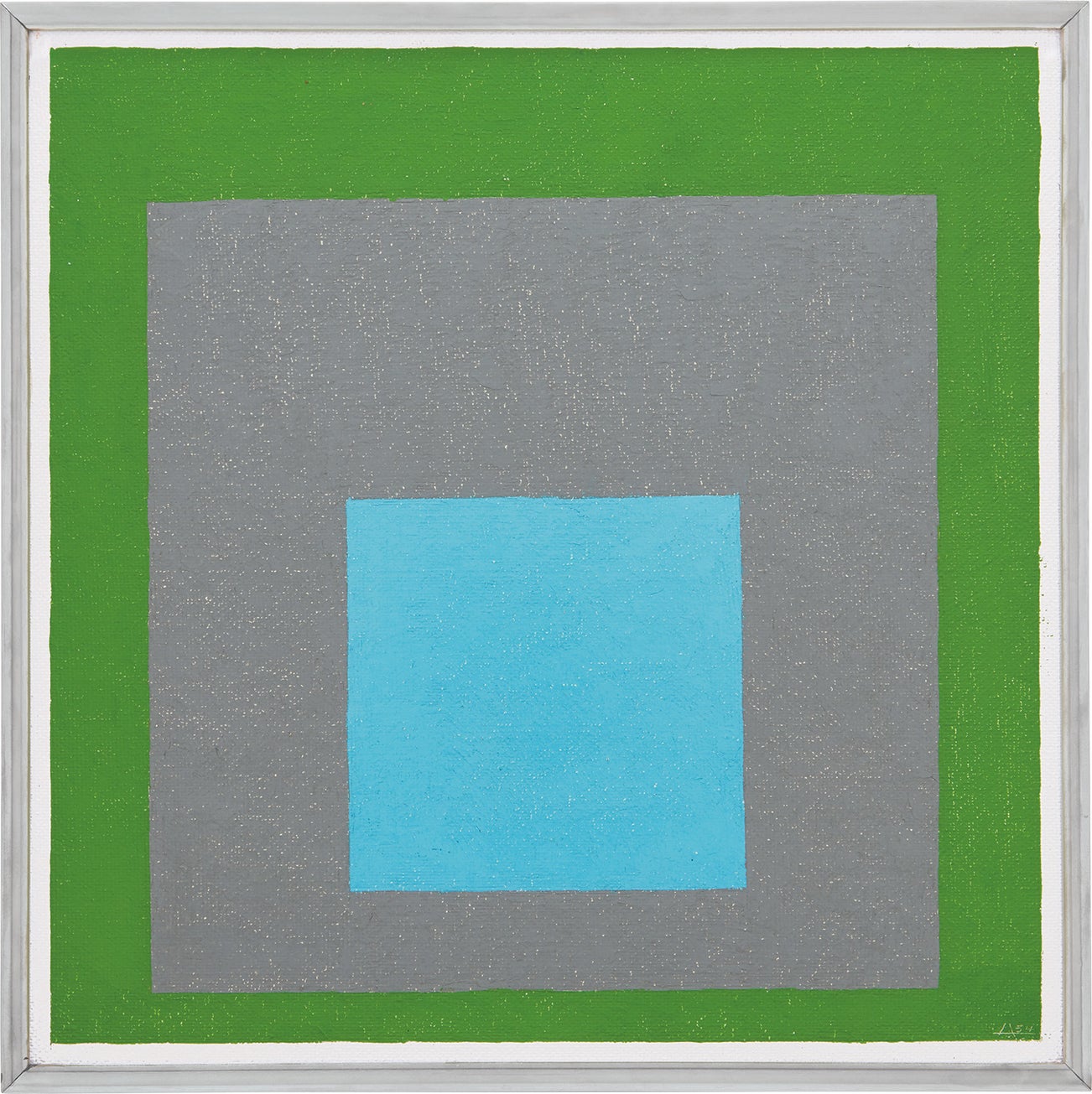Each Homage to the Square is subtly differentiated by its hierarchy of colors and particular application of paint, and Looking Outis centered around a small blue square, nested inside a warm gray and finally a rich grass green border. For Albers, the purpose of the integration of colors was to evoke different moods and visual effects through the contrasting combination of interlapping squares, each of which, he felt, was as different as an individual portrait. “For me, a triangle has a face. A square, a circle – any elemental form – has features and therefore a ‘look'. They act and provoke our reactions, just as complex forms, such as human or other faces and figures do,” Albers stated (Josef Albers, quoted in Elaine de Kooning, “Albers Paints a Picture”, ArtNews, vol. 49, no. 7, pt. 1, November 1950, p. 41). The title of each work is critical in summoning the “personality” associated with that work, since Albers titled his works according to the distinct process of making and the emotions he associated with them.