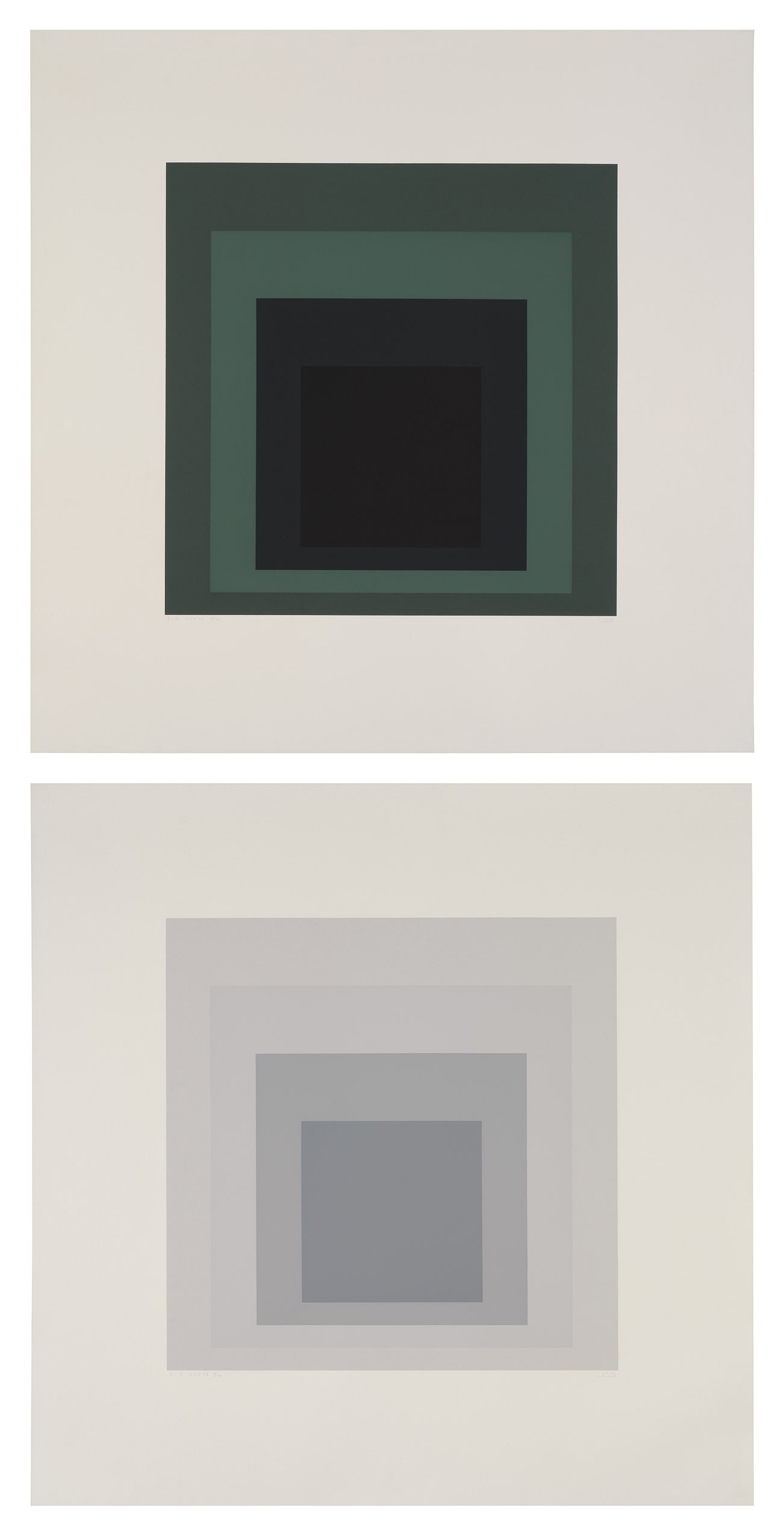Both signed with initials, titled, dated and numbered 9/100 in pencil (there were also 25 artist's proofs), published by Ives-Sillman, Inc., New Haven, to commemorate Albers' 84th birthday (with their blindstamp), framed together.