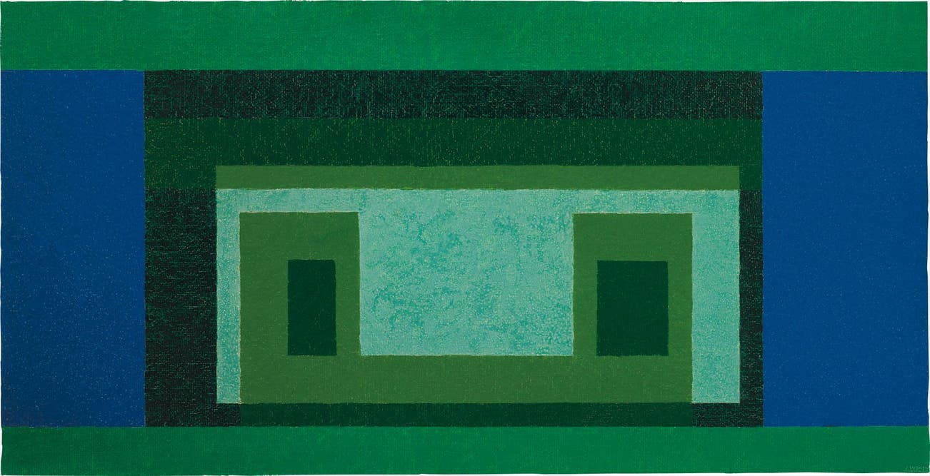 The “Variant/Adobe” works take subtle inspiration from the adobe architecture Albers encountered during extensive travels to Mexico and Latin America in the 1930s and 1940s. Variant Five Greens and Blue, 1947-54 vaguely diagrams a low-slung house facade with windows or doors. By making this reference in a decidedly reduced language, Albers probes the relationship between representation and abstraction.Throughout his lifetime, Albers conducted formal experiments that would come to redefine visual perception in the modern era. Variant Five Greens and Blue, 1947-54 demonstrates the analytical mindset of Albers, a critical predecessor of minimalist, conceptual and op art.