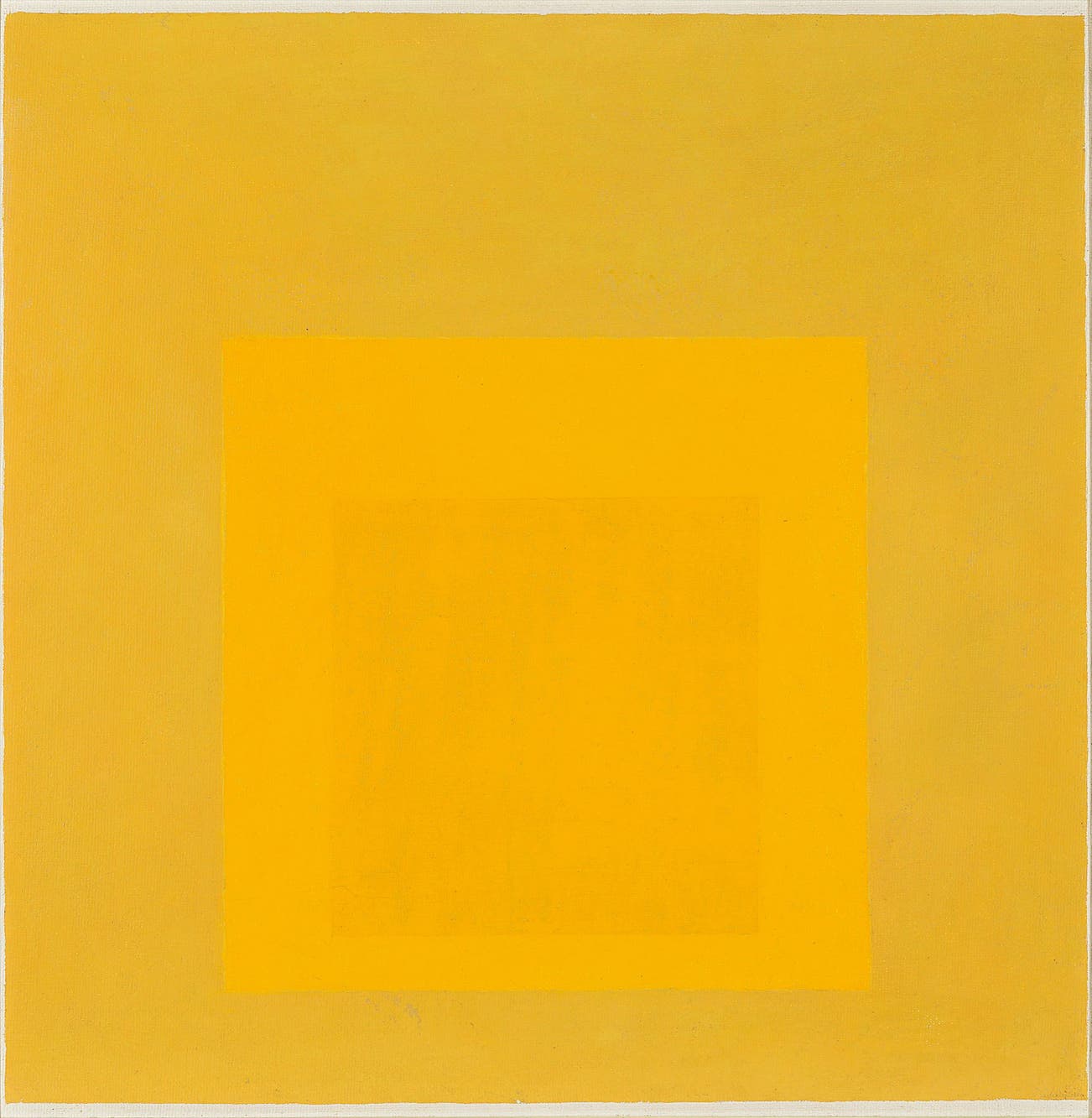 In 1933, under Nazi pressure the Bauhaus school closed and Albers emigrated to the United States where he settled in north Carolina and taught at Black mountain college. His pupils of this time included amongst others, Cy Twombly and Robert Rauschenberg and his teaching was to be considered some of the most influential and progressive of its day. In 1950, at the age of 62, Albers embarked on his most celebrated series, titling each work the same: Homage to the Square. Each of the abstractions, combining either three or four uniquely coloured squares geometric placed within another, uses a basic composition to emphasise the complexity of colour perception. The regimented square framework, stripped of artistic licence, focuses the eye solely on the fundamental interplay between colours. This scientific practice is reiterated by the factual notes left on the reverse of each work, stating the exact colours used. For the viewer, the exploration of colour, combined with regulated forms, creates an intriguing illusion of space and depth to the painting surface. The present lot, which depicts three golden yellow squares, each darker than the outmost, offers the effect of three-dimensionality in such a way that the viewer could be looking down on a truncated pyramid.