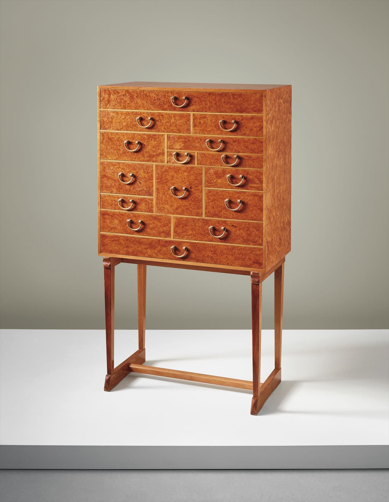 From the Svenskt Tenn archive is a preparatory drawing, circa 1938, by Frank for a cabinet-on-stand, with the model no. 881 (Ibid, p. 230). The drawing depicts nineteen drawers but states twenty-one; the design was refined further and produced with different veneers, textiles, scales and hardware.