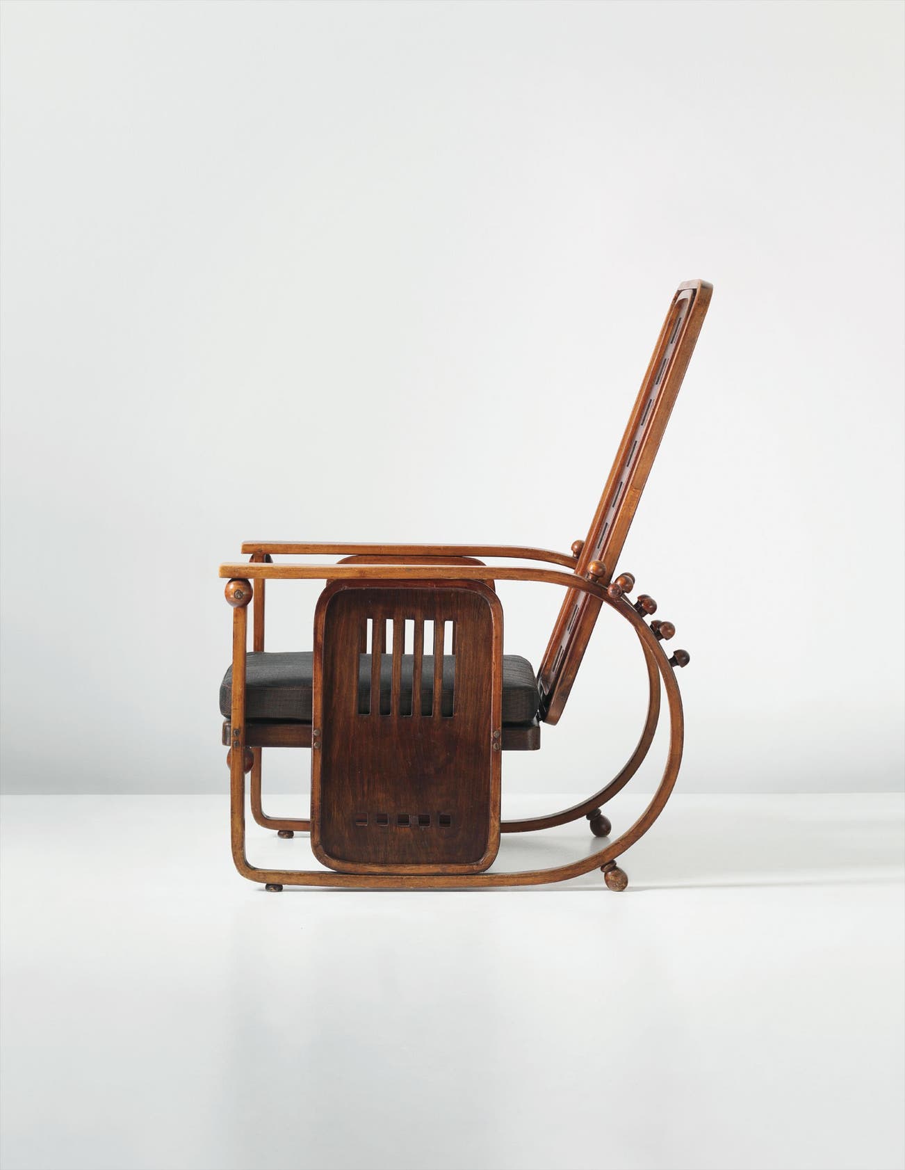 Bent beechwood, beech-veneered plywood, beech, brass, fabric.