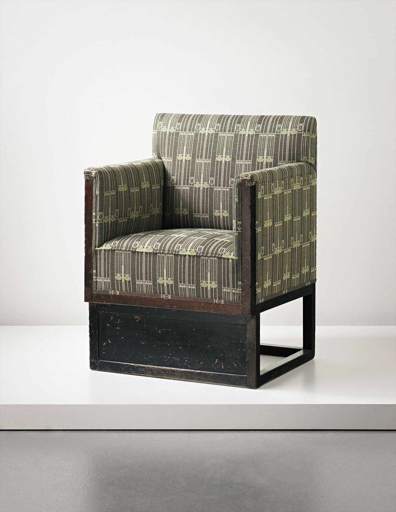 The present model chair has been reupholstered by Eiting Räume, Cologne in a replica of the 'Notschrei' fabric produced by Backhausen & Söhne, Austria who originally executed fabrics for the Wiener Werkstätte, Austria. This fabric was acquired in the 1990s and is no longer in production.