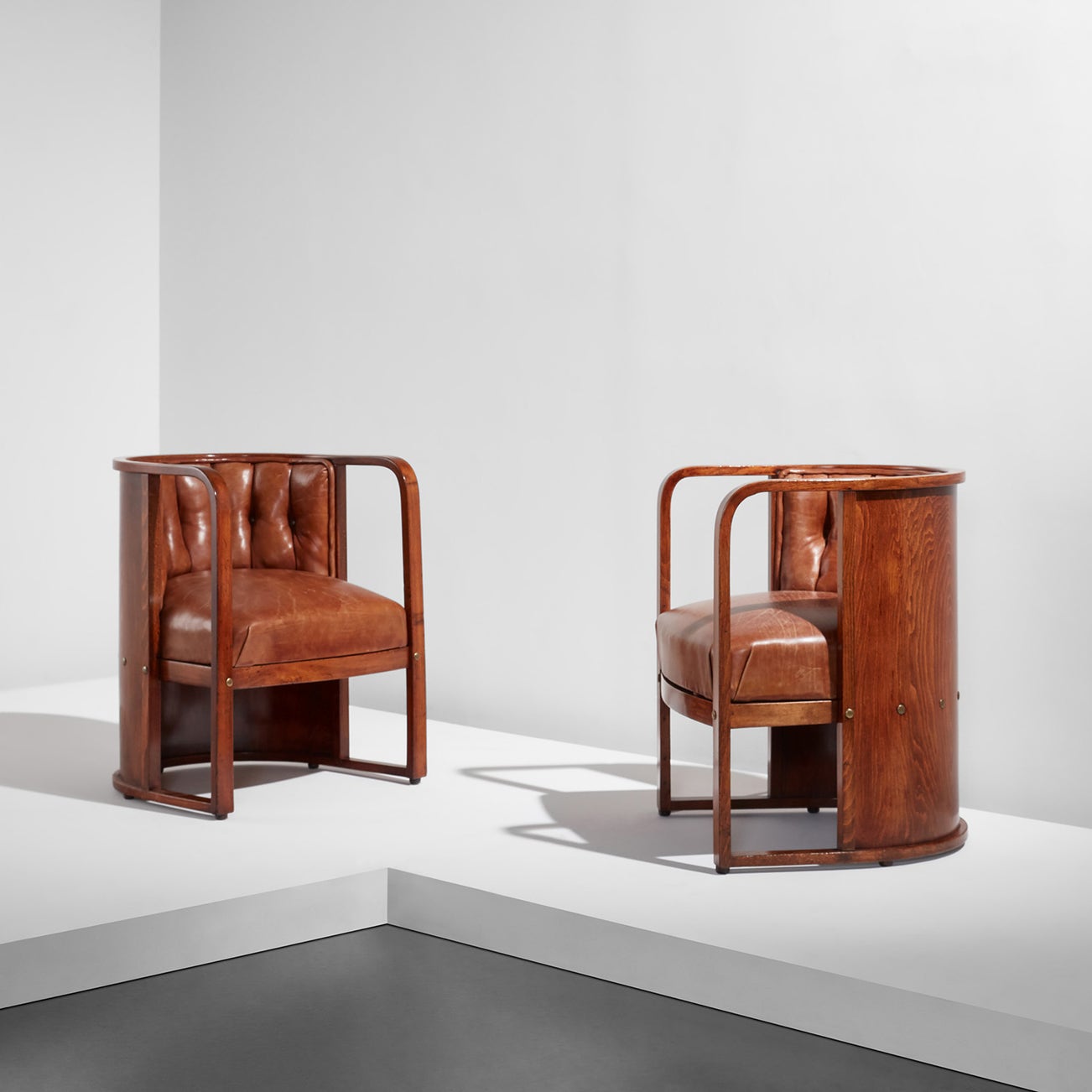 The present model of Hoffmann’s armchairs exemplifies his celebration of form. A template he returned to frequently, the barrel armchairs curve around their sitter, achieving a streamlined and compact effect. While the curvilinear form introduces a geometric fluidity without relying on the fanciful profiles of Art Nouveau, the leather upholstery promises comfort in its gentle sumptuousness. Widely employed in public commissions and private residences alike, a version of the barrel armchair furnished the famed Cabaret Fledermaus in Vienna.
