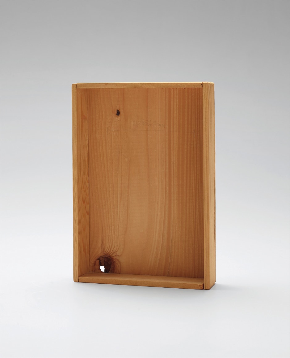 Wooden box with handwritten pencil addition.