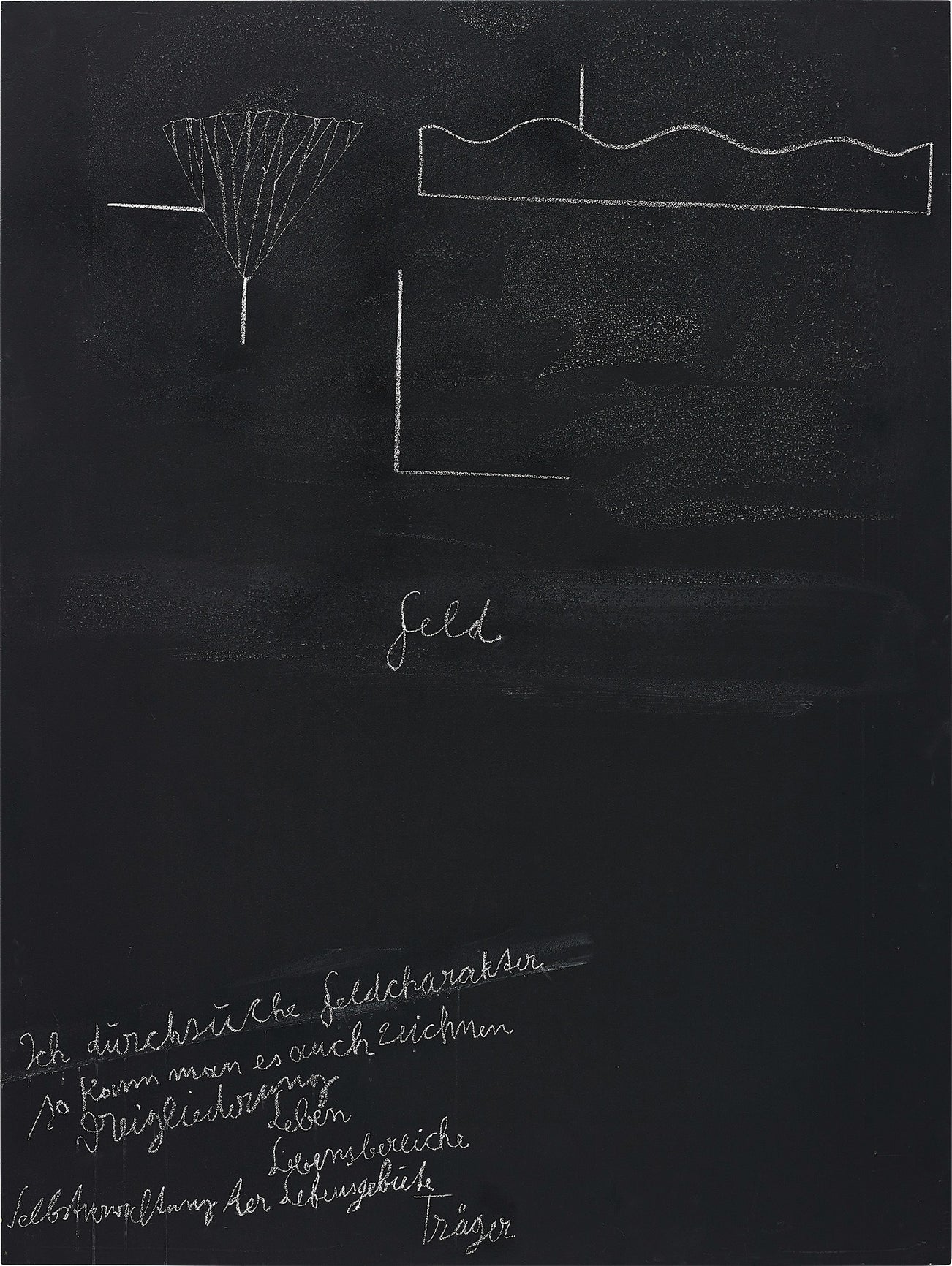 Joseph Beuys’s pluridisciplinary approach to art often pushes his creations beyond the confines of their medium. Unbetitelt (Feld), created in 1972 and composed of chalk on board, could neither be defined by its supporting structure, nor epitomised by the German scrawls left atop its otherwise vast surface. Rather, it is a polyvalent object endowed with multiple meanings, existing as a living proof of the performative occurrence it witnessed. Acquired directly from the artist and having remained in the same collection for over forty years, Unbetitelt (Feld) furthermore exudes a rare, intimate feel.