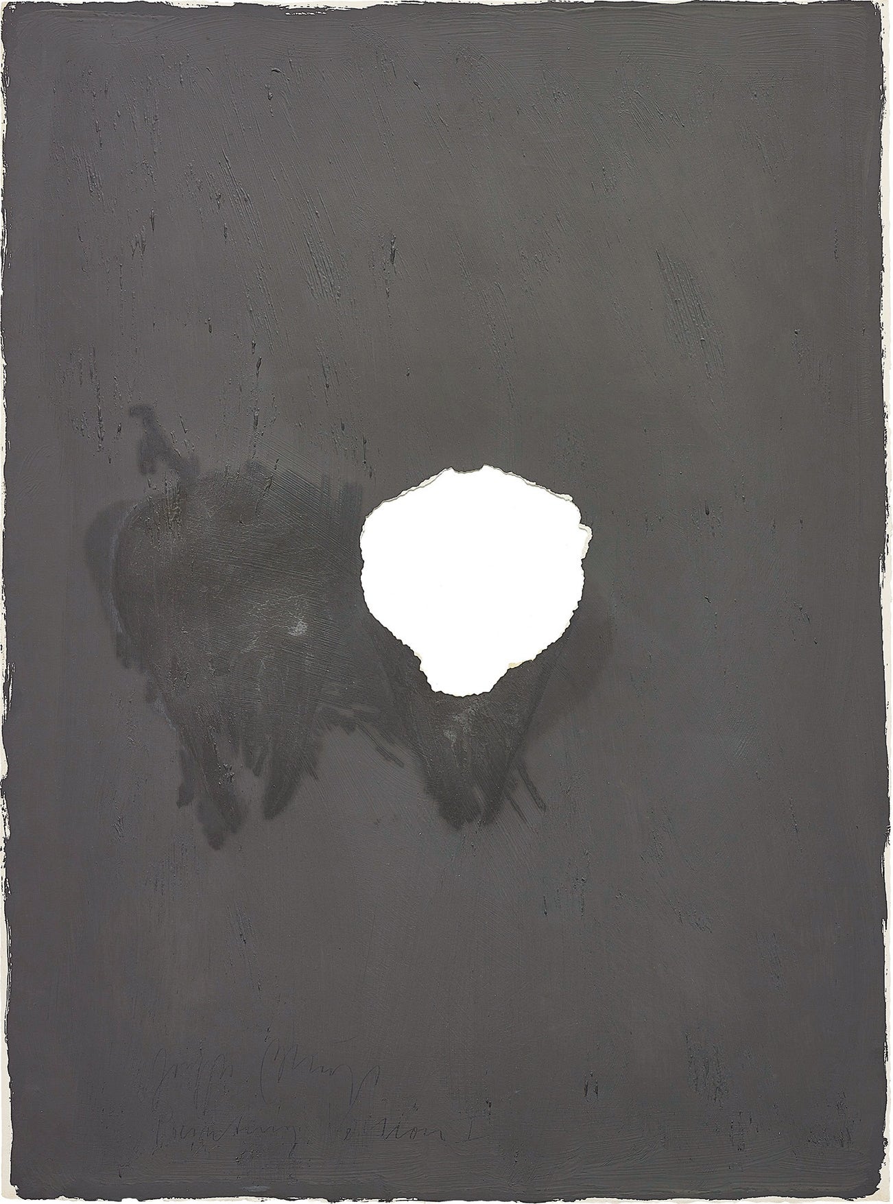 Oil paint and butter, on BFK Rives paper, the full sheet, with torn hole.