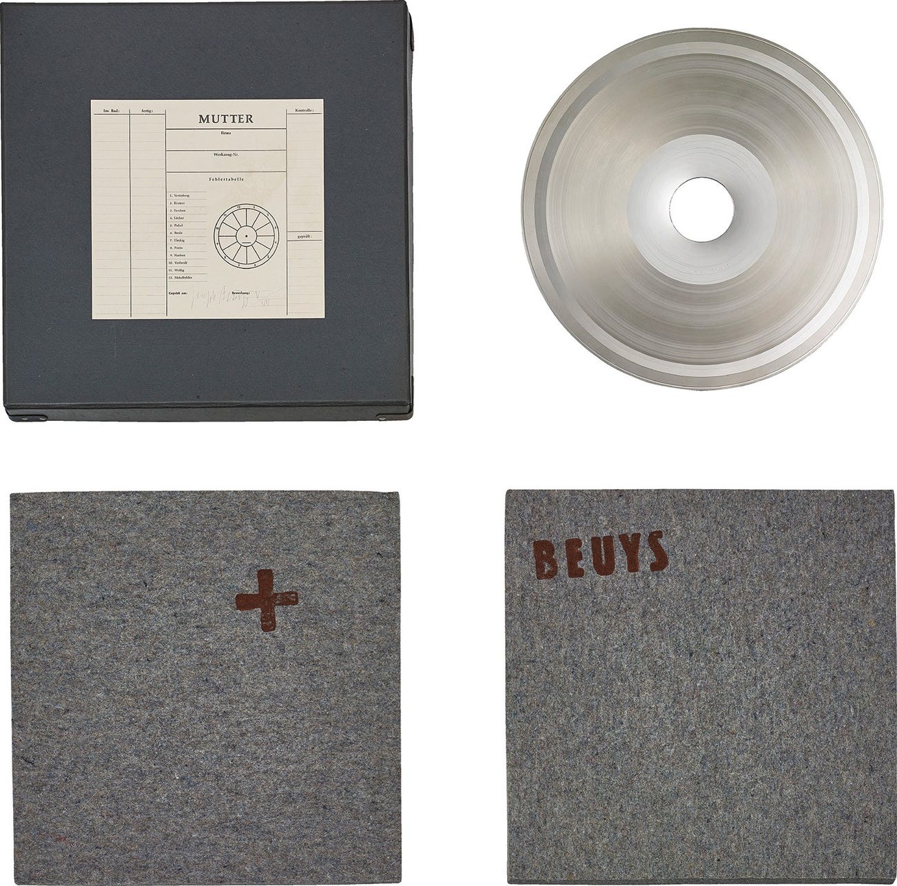 Record matrix (nickel-plated copper) with die-cut hole, two felt pads stamped with brown paint, contained in original black cardboard box.