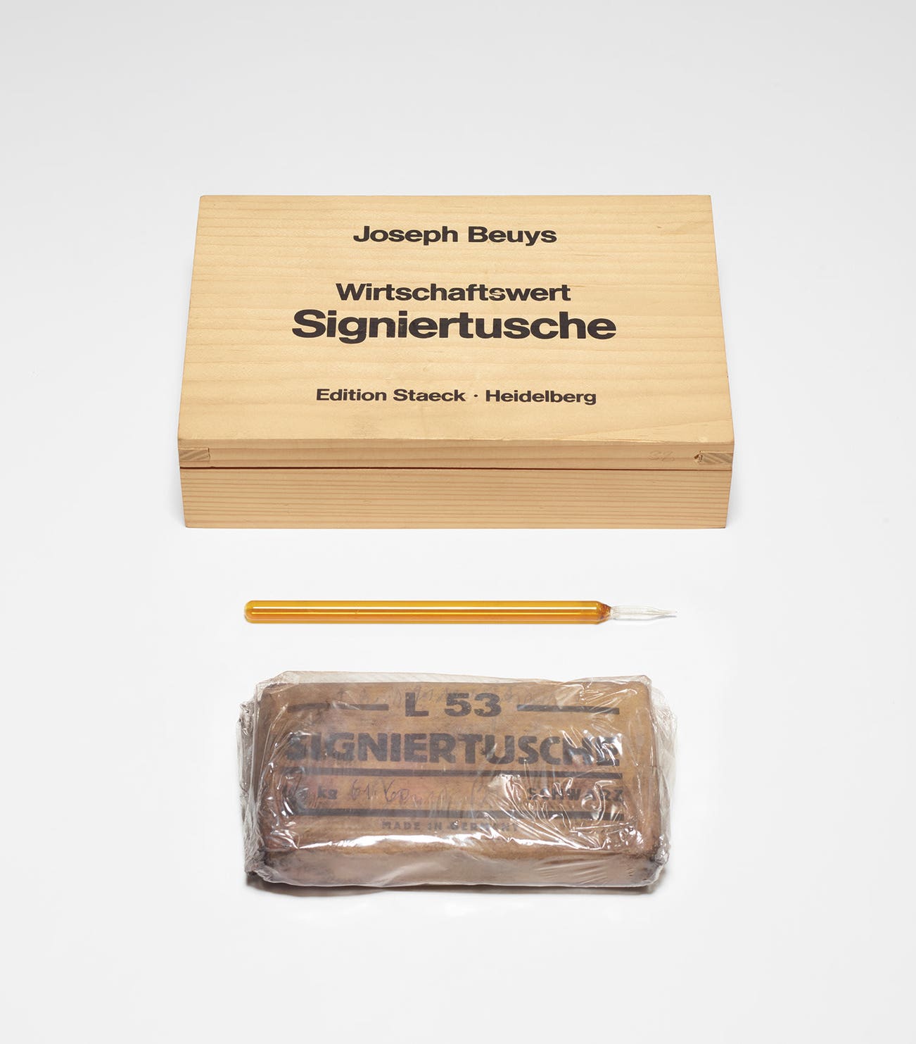 Multiple comprised of a block of Signiertusche ink in the original wrapper, with hand-written additions, and a glass pen, all contained in the original wooden box with printed artist's name and title.