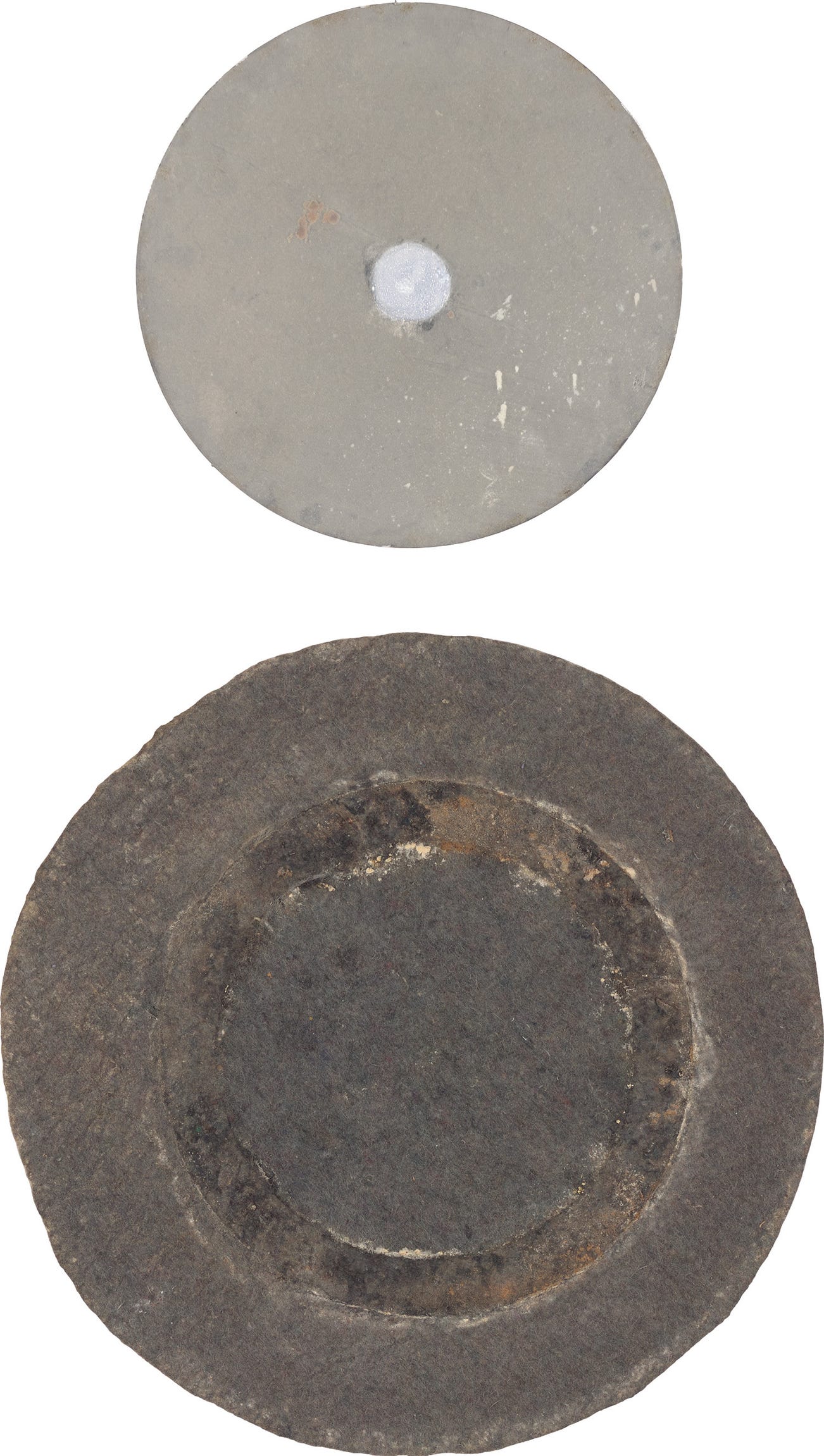 Unique work comprised of mirrored glass disc and embossed felt disc, framed.
