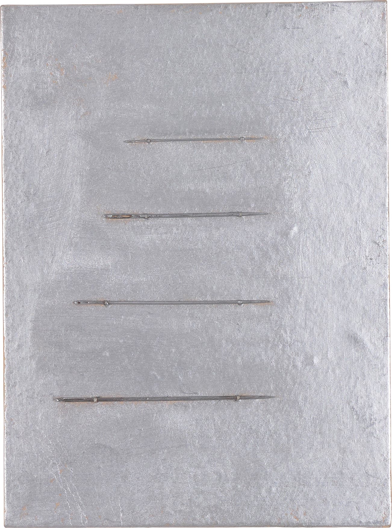Unique work comprised of needles, thread and silver bronze on cardboard.