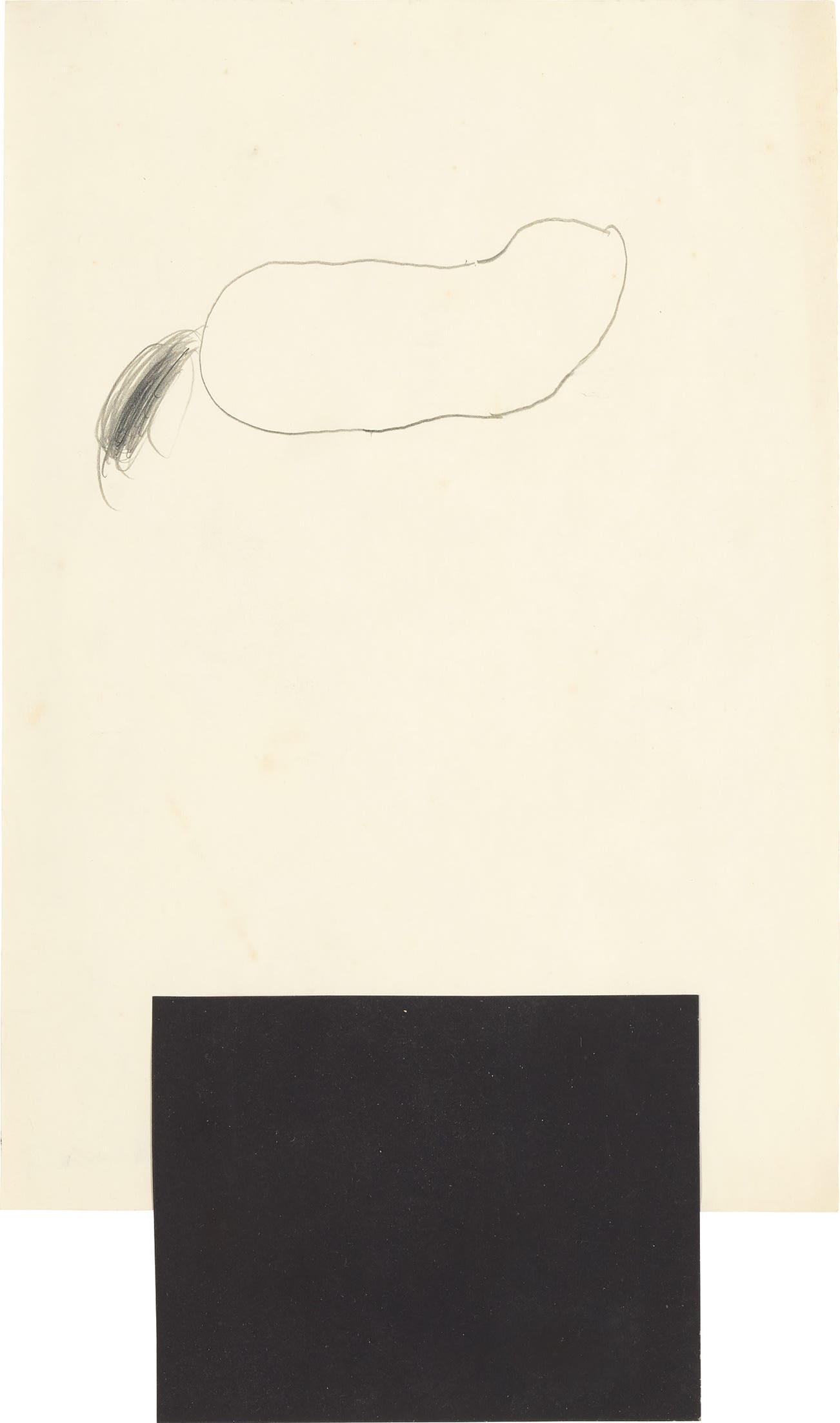 Graphite drawing, on light wove paper with black plastic foil collage.