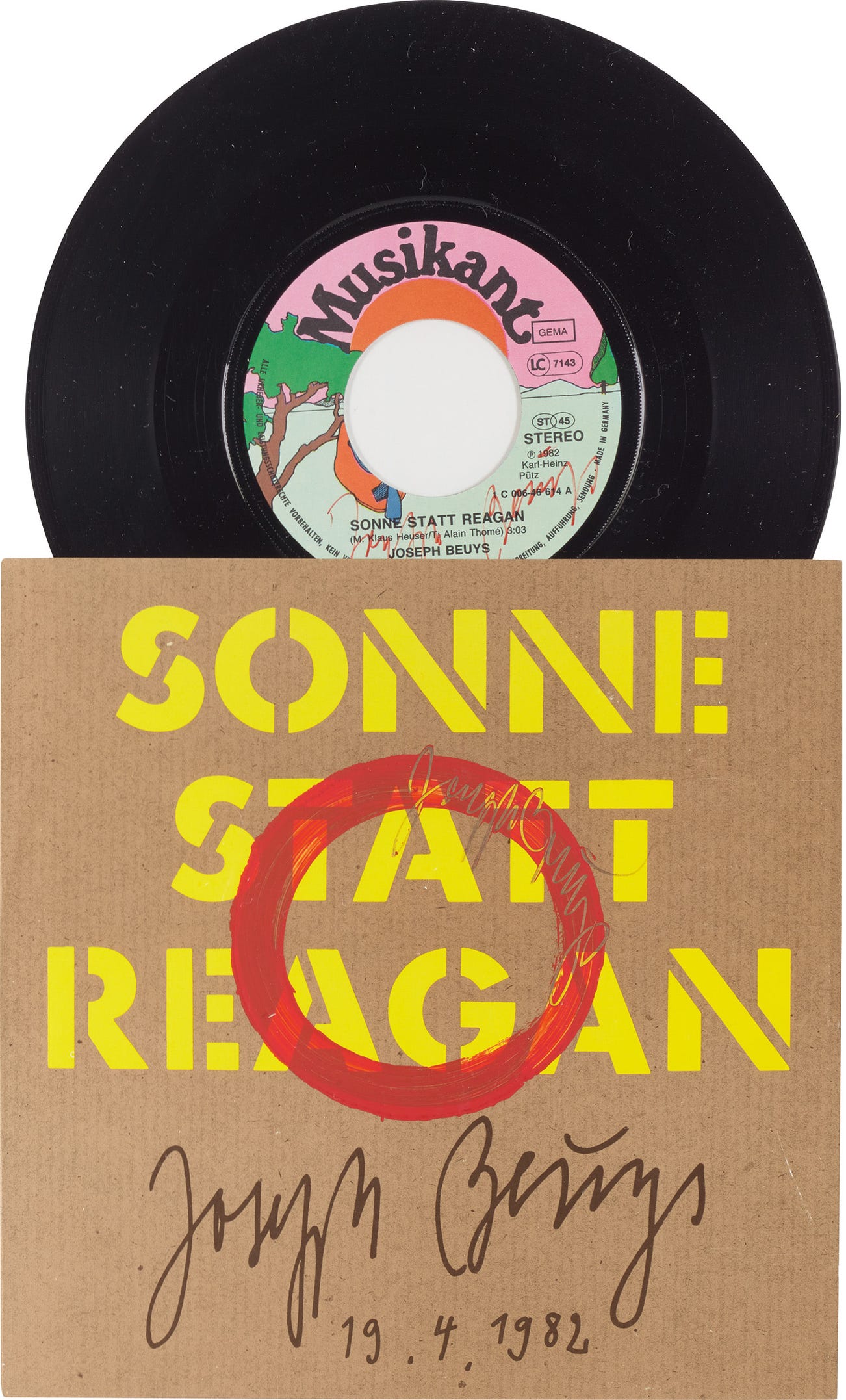 Signed in red ink on the record label, further inscribed with signature in the red oil paint on the sleeve, from the unnumbered edition of 90, published by Edition Staeck, Heidelberg, framed.