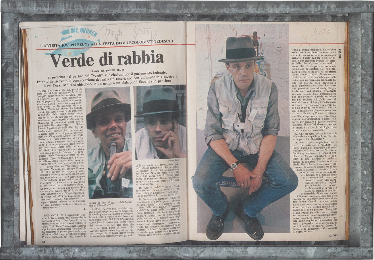 L'Espresso newspaper, with a zum Europa-Parlament Wählt die Grünen inkstamp, contained in the original galvanized iron box.