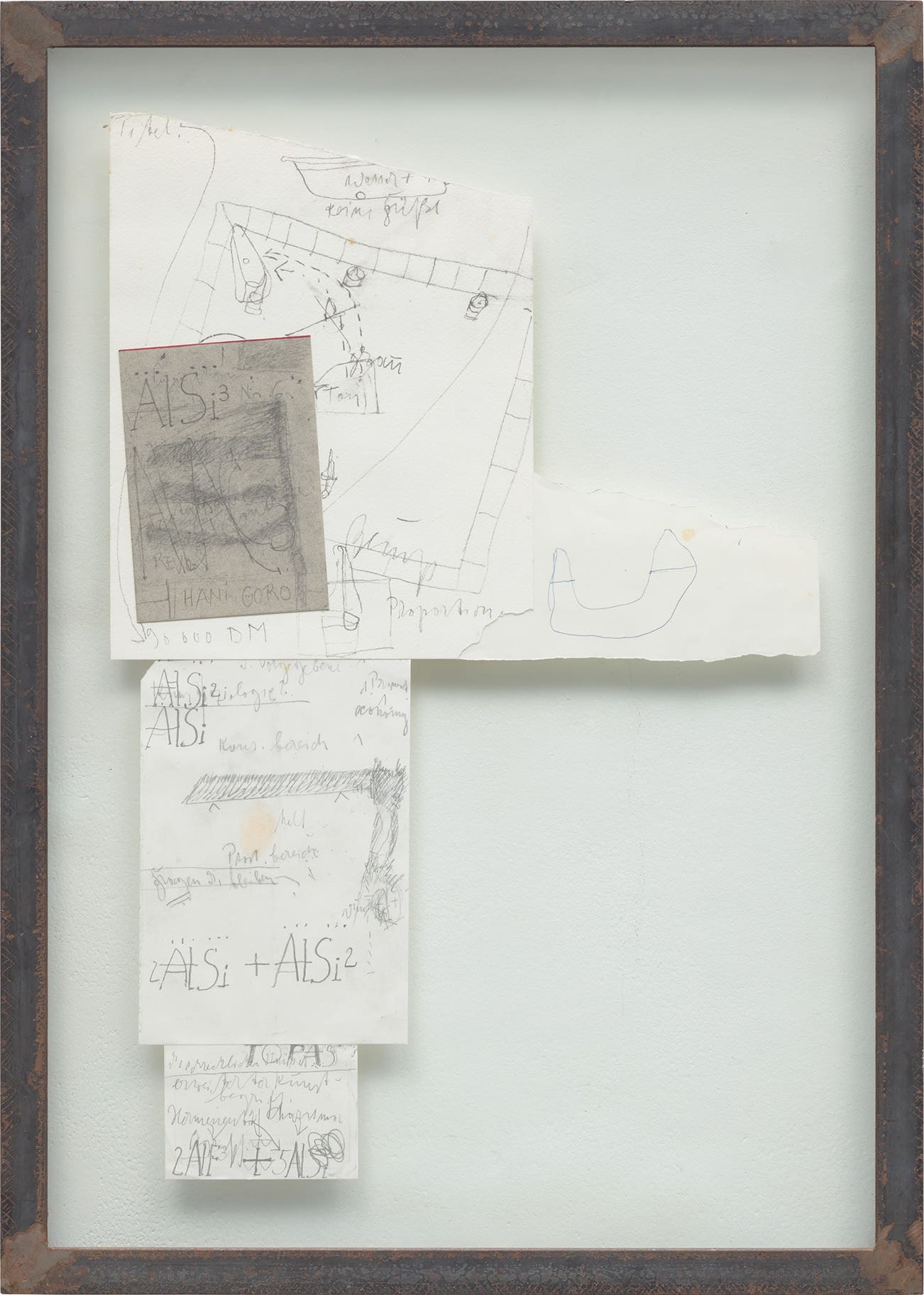 Collage of facsimile prints, contained in the original iron frame under glass.