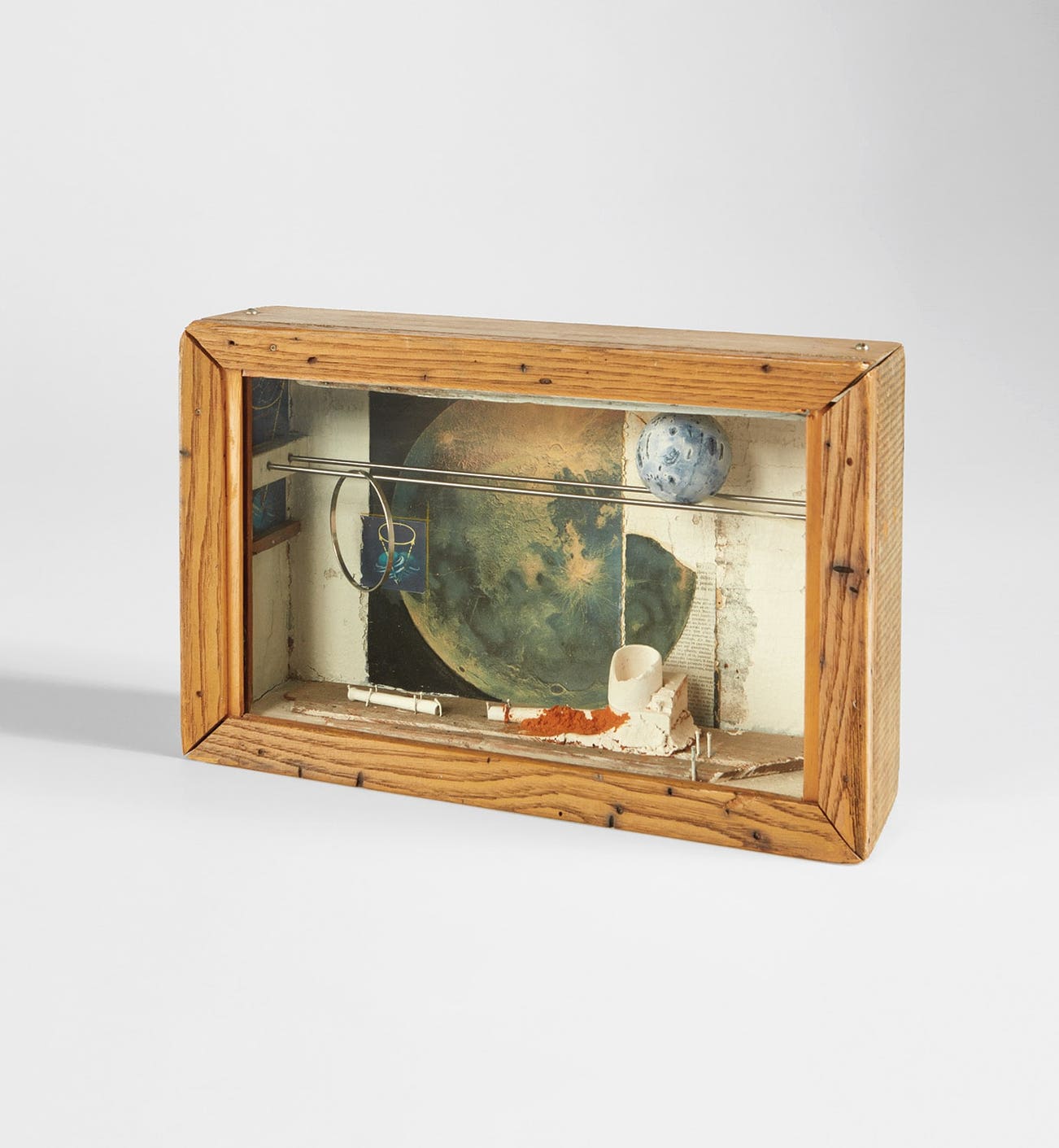 Cornell ingeniously explores the connection between scientific and childhood imagination in works such as the present one. As with many of Cornell’s shadow boxes, and in particular the Soap Bubble Set series,Untitled features a painted cork ball that rolls freely on a pair of horizontal rods in a manner that echoes Galileo Galilei’s 17th century experiments of motion, as well as the 18th century orrery model of the solar system. Cornell’s signature Dutch clay pipe features prominently in the foreground, here fractured on the ground and partially embedded in a bed of sand. Echoing Man Ray's Ce qui manque à nous tous, 1936, the pipe is one of the most reoccurring objects in Cornell’s oeuvre and speaks of the artist's favorite childhood pastime of blowing soap bubbles. Seen in this light, the moon and the moving ball take on the form of large soap bubbles floating through Cornell’s imaginary universe. As such, Untitled vividly reminds us, as Angela Kramer Murphy put forward, that "our understanding of the cosmos is predicated not only on how far we can see, but on how much we can imagine" (Angela Kramer Murphy, “Imaginary Voyages”, in Joseph Cornell, Cosmic Travels, exh. cat., Whitney Museum of American Art, New York, 1999, n.p.).