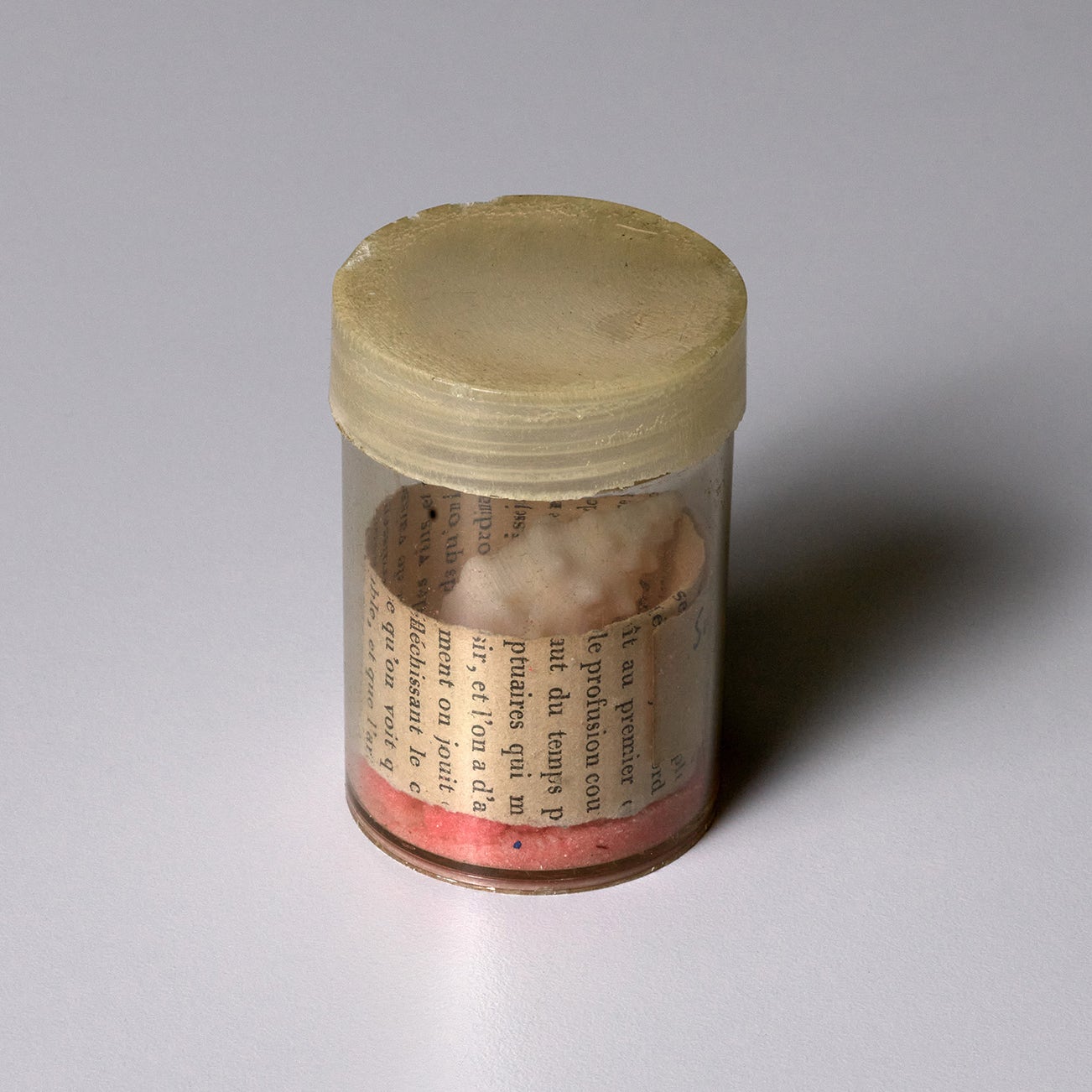 conch shell, book page clipping and pink salt stones in plastic Whitman Dollar container