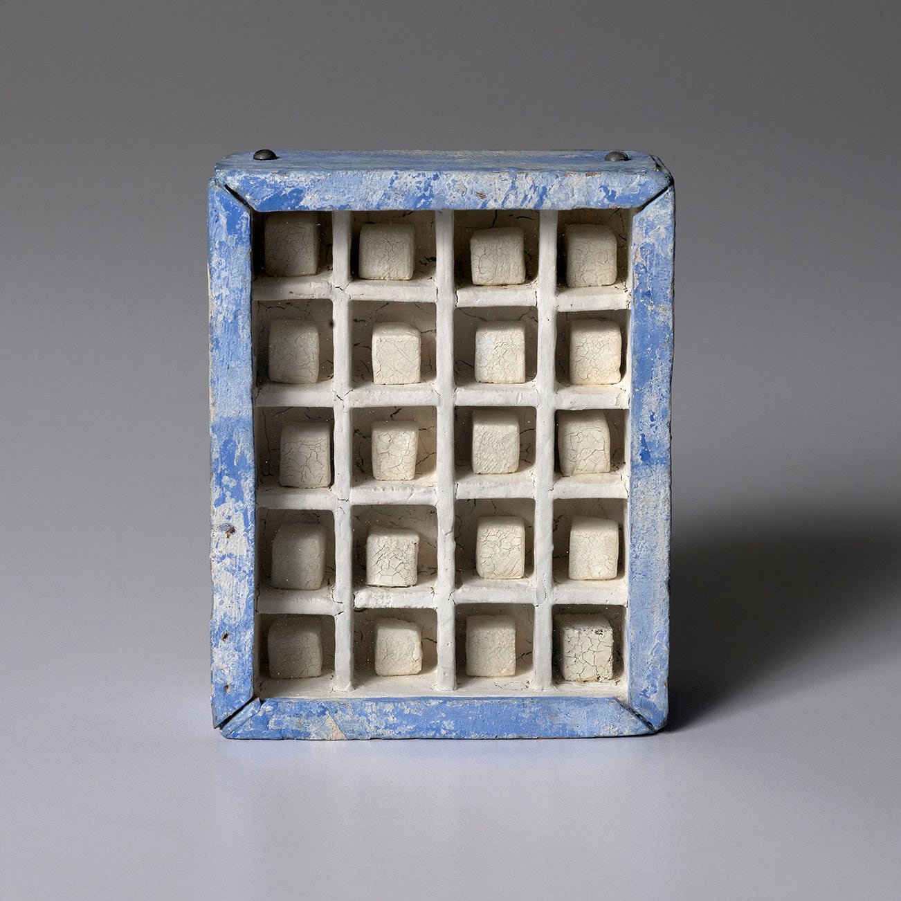 mixed media in glass-faced wooden box construction (with printed paper collage on the reverse)