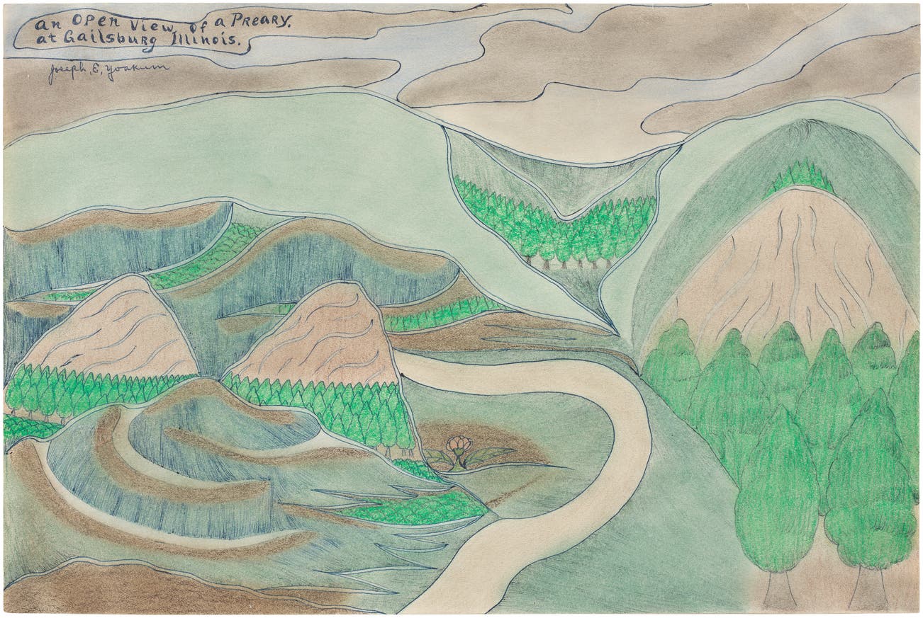 signed and titled "an open view of a Preary. at Gailsburg Illinois. Joseph E. Yoakum" upper left