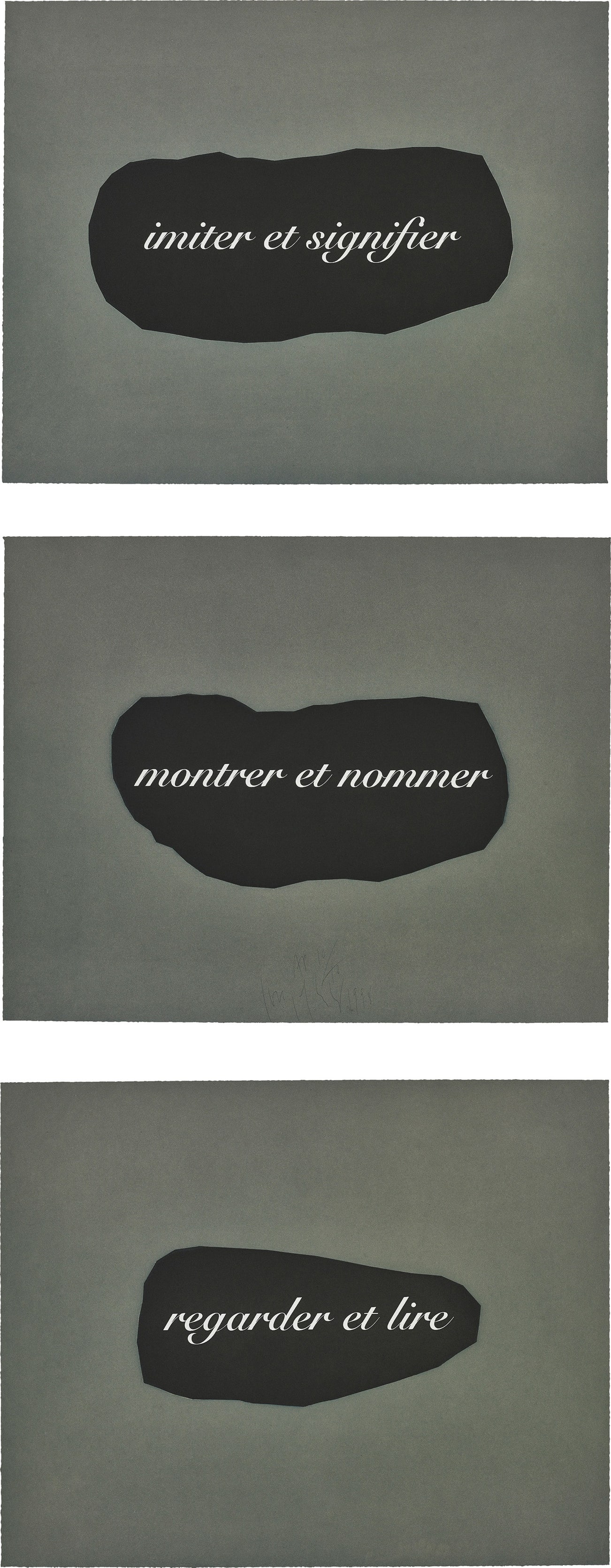 montrer et nommer signed, dated and numbered 'AP 10/10' in pencil on the front, imiter et signifier and regarder et lire signed and dated in pencil on the reverse (an artist's proof set aside from the edition of 60 plus 10 in Roman numerals), published by Edition Schellmann, Munich and New York (with their inkstamp on the reverse), all framed.