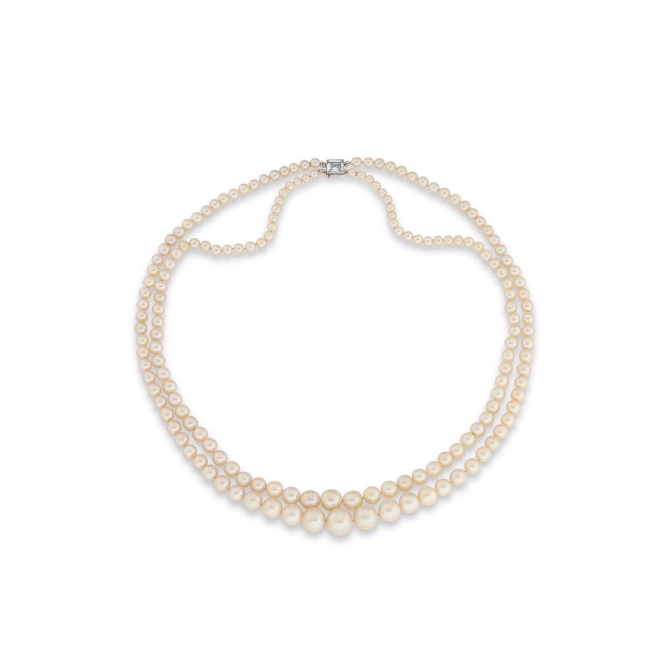 Composed of two strands of natural pearls measuring from approximately 10.15mm to 3.45mm, the clasp set with a step-cut diamond, shortest length approximately 450mm, longest length approximately 475mm, the clasp with maker's mark for Joseph Templier and French assay mark for gold.