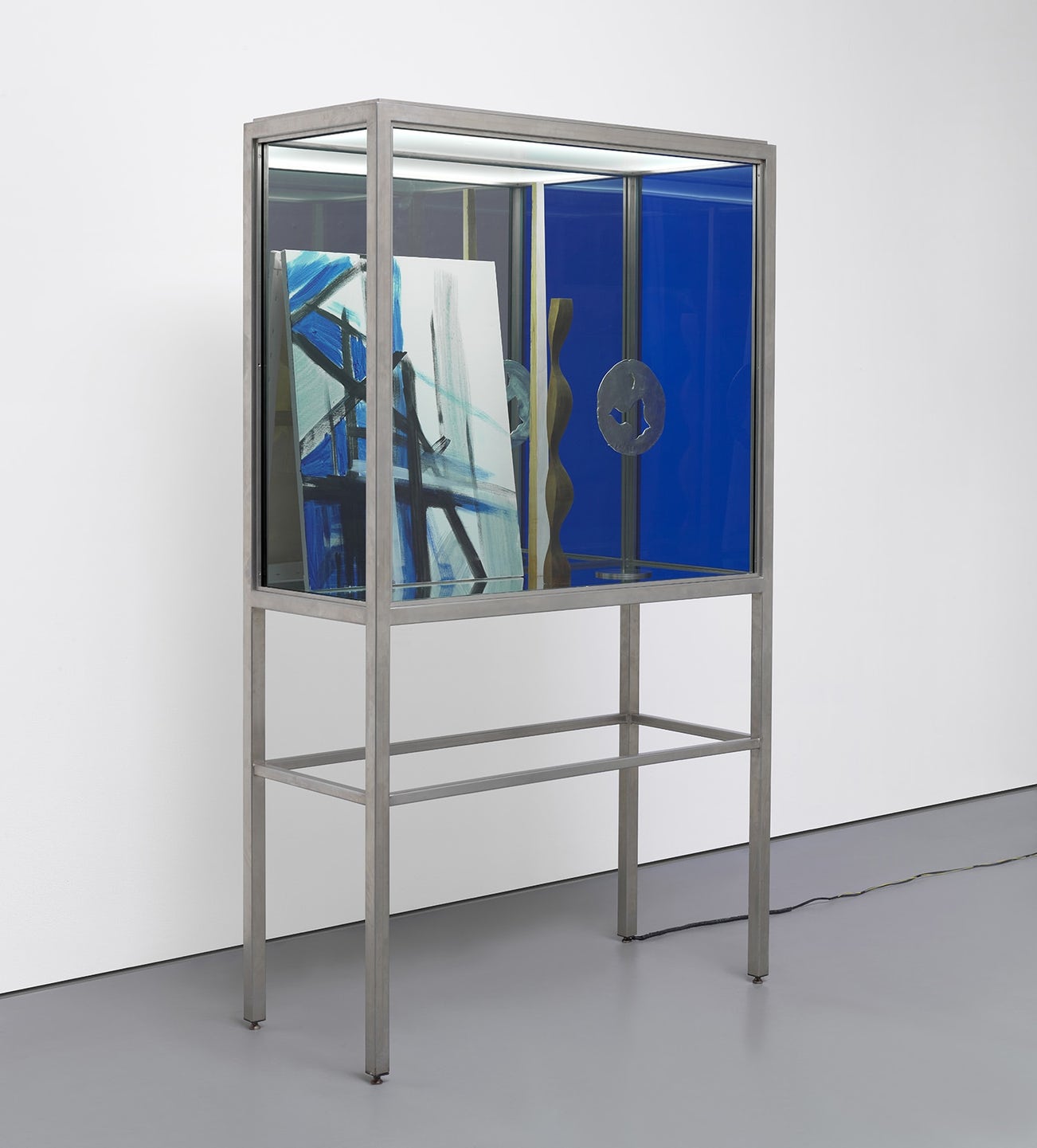 mixed media in stainless steel and glass vitrine with fluorescent light and acrylic sheeting