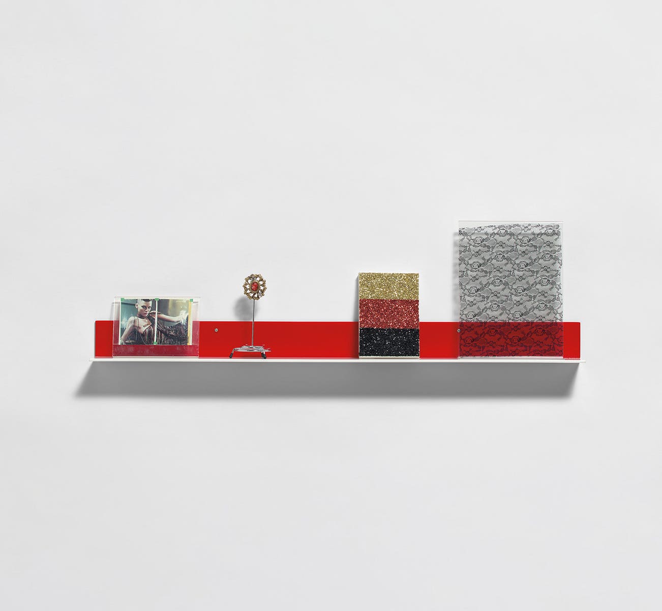 chromogenic print in Plexiglas case, found jewelry on metal stand, glitter on canvas, lace fabric in Plexiglas case on acrylic shelf