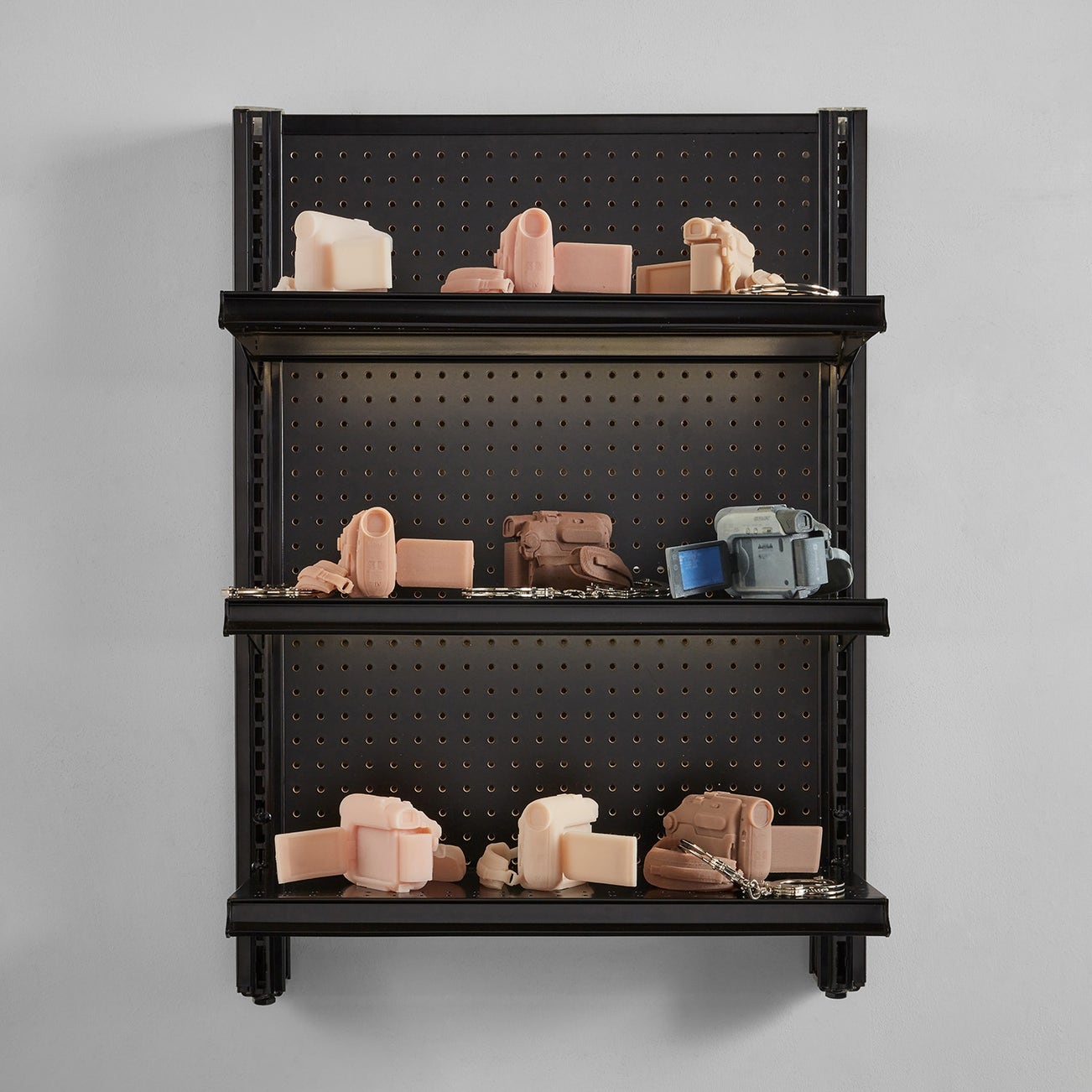 9 cast silicone cameras, 4 metal handcuffs, 1 3D-printed plaster camera, inkjet ink, cyanoacrylate, commercial shelving with LED lights and power cable
